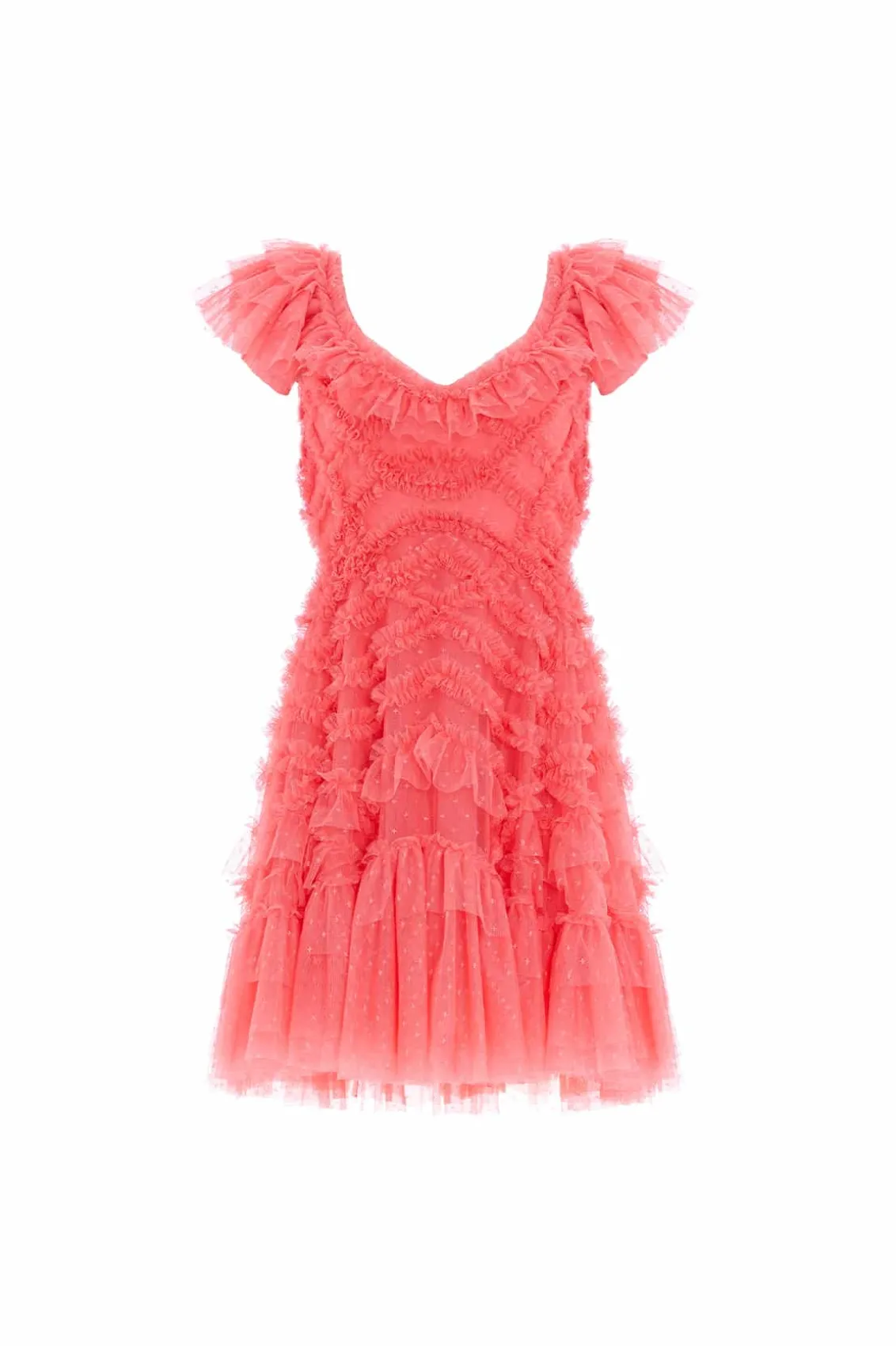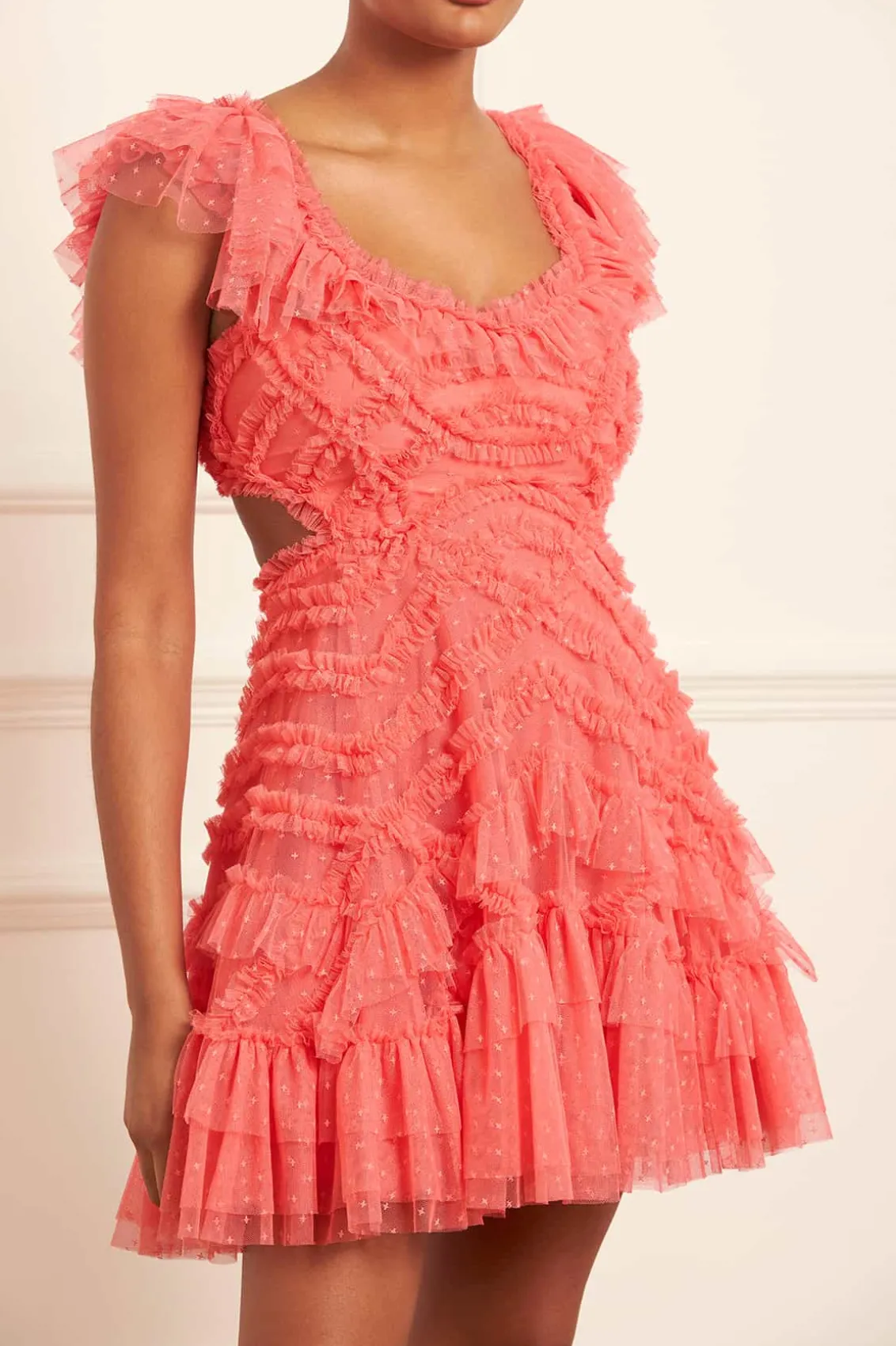 The Lola Backless Micro Mini Dress in Pink Sky. This pretty dress is designed with signature Needle & Thread elements. Beautifully adorned with soft tulle and gathered frills, creating a frothy, engineered textile. This mini dress features a backless design for a romantic, playful look. The perfect dress for a wedding guest, birthday or upcoming special event.