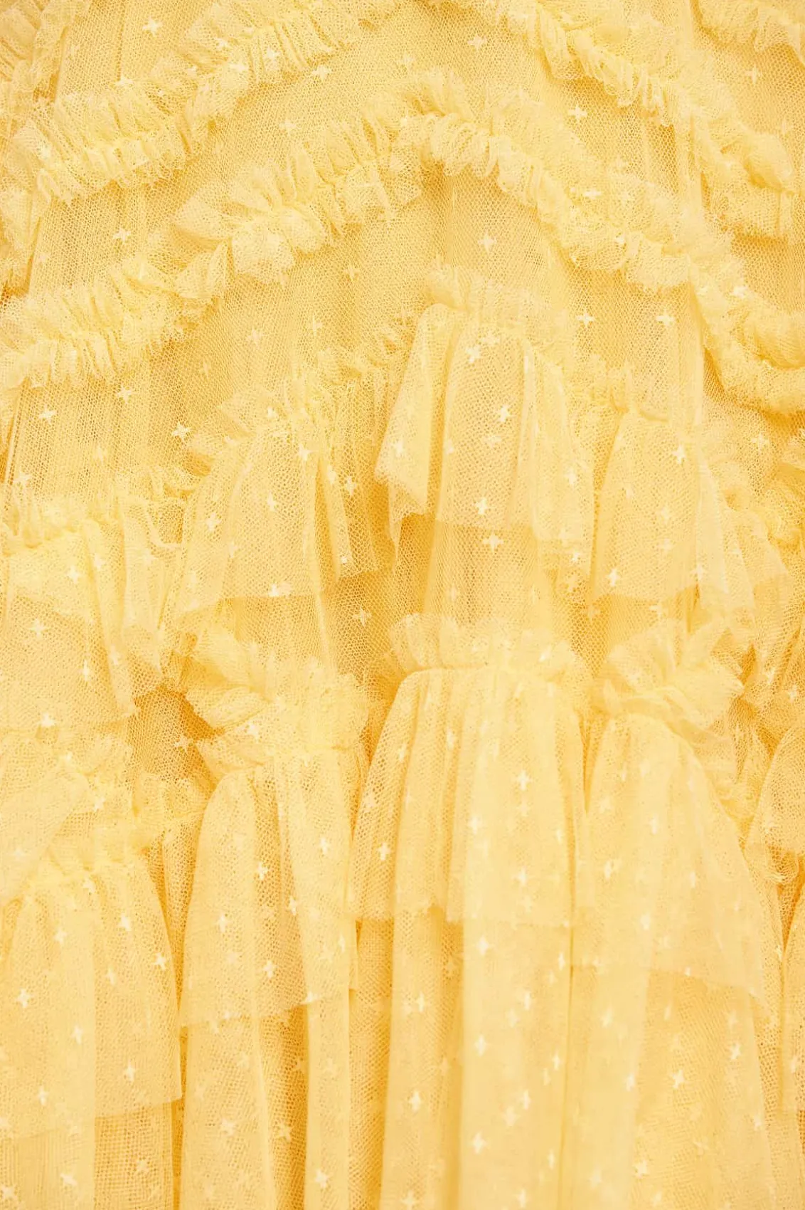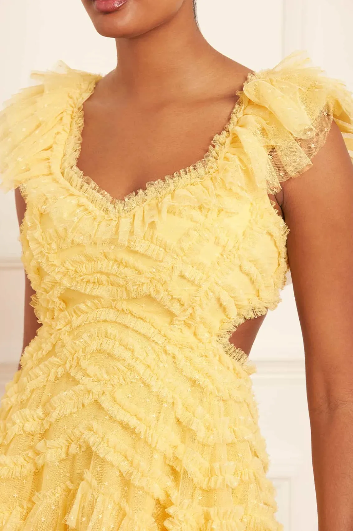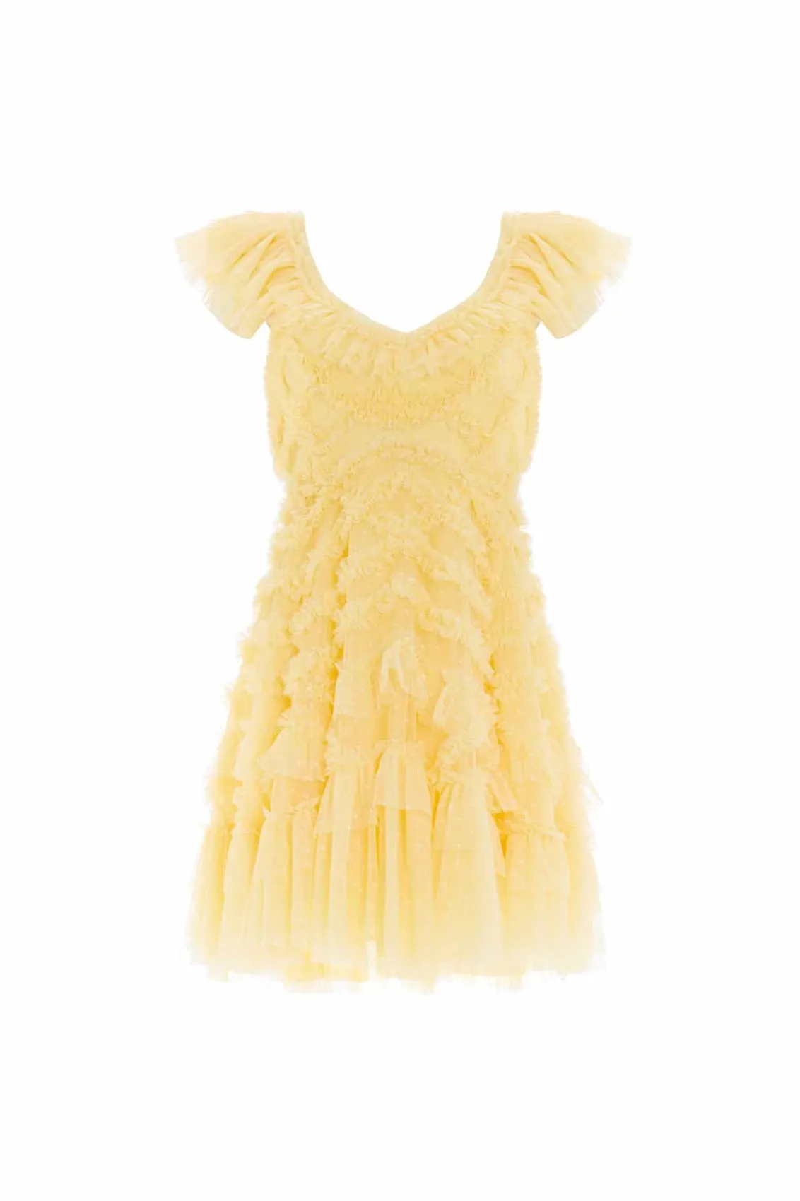 The Lola Backless Micro Mini Dress in Lemon. This pretty dress is designed with signature Needle & Thread elements. Beautifully adorned with soft tulle and gathered frills, creating a frothy, engineered textile. This mini dress features a backless design for a romantic, playful look. The perfect dress for a wedding guest, birthday or upcoming special event.