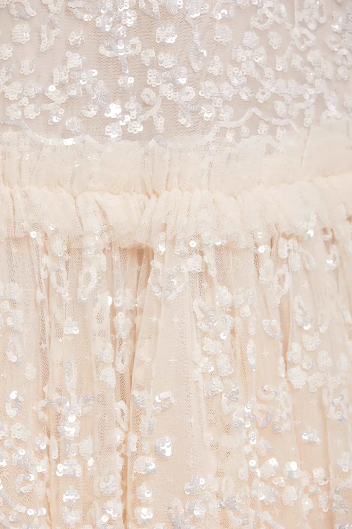 The Regal Rose Gloss Strapless Micro Mini Dress in Cream. The Regal Rose is decorated with elegant, floral artwork featuring delicate lace. This dress is developed with a fitted corset bodice and then flows into a dramatic, voluminous skirt. The integrated corset is made with ribbon stitching, soft boning and panels of stretch mesh fabric for comfort and security in the fit. The perfect dress for a special moment.