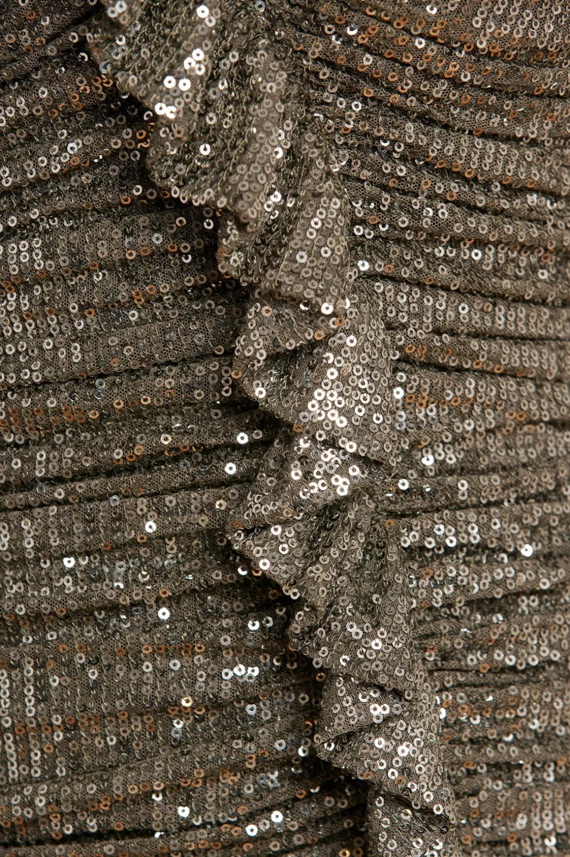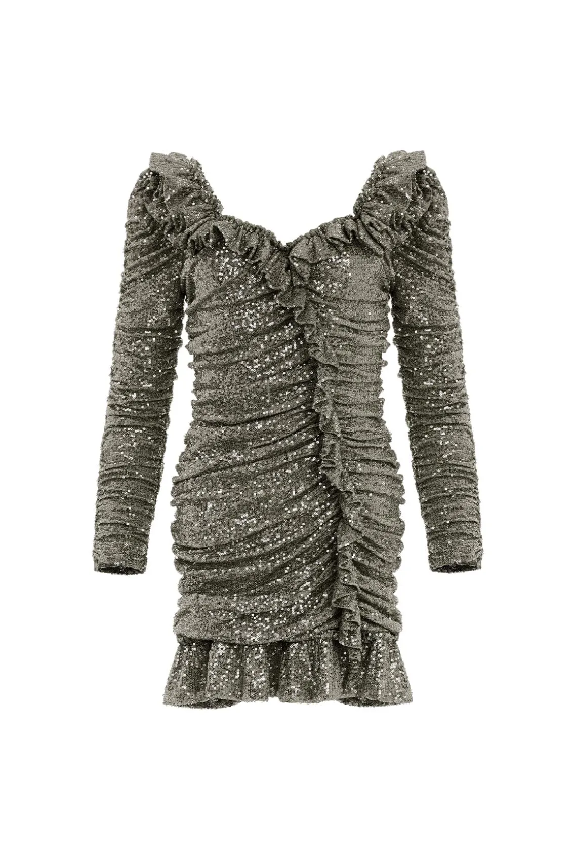 The Sunbeam Rouched Long Sleeve Micro Mini Dress in Juniper. A brand new style for the season ahead. This dress is made from specially sourced sequin fabric, created using the tiniest sequins carefully stitched to the stretch mesh base, creating an all-over shimmering fabric. This mini dress is developed with a flattering silhouette using an expert technique featuring folded frill details for Needle & Thread signature elements. This style is fully lined in power mesh to create ultimate fit and comfort. The perfect piece to shine in golden hour.