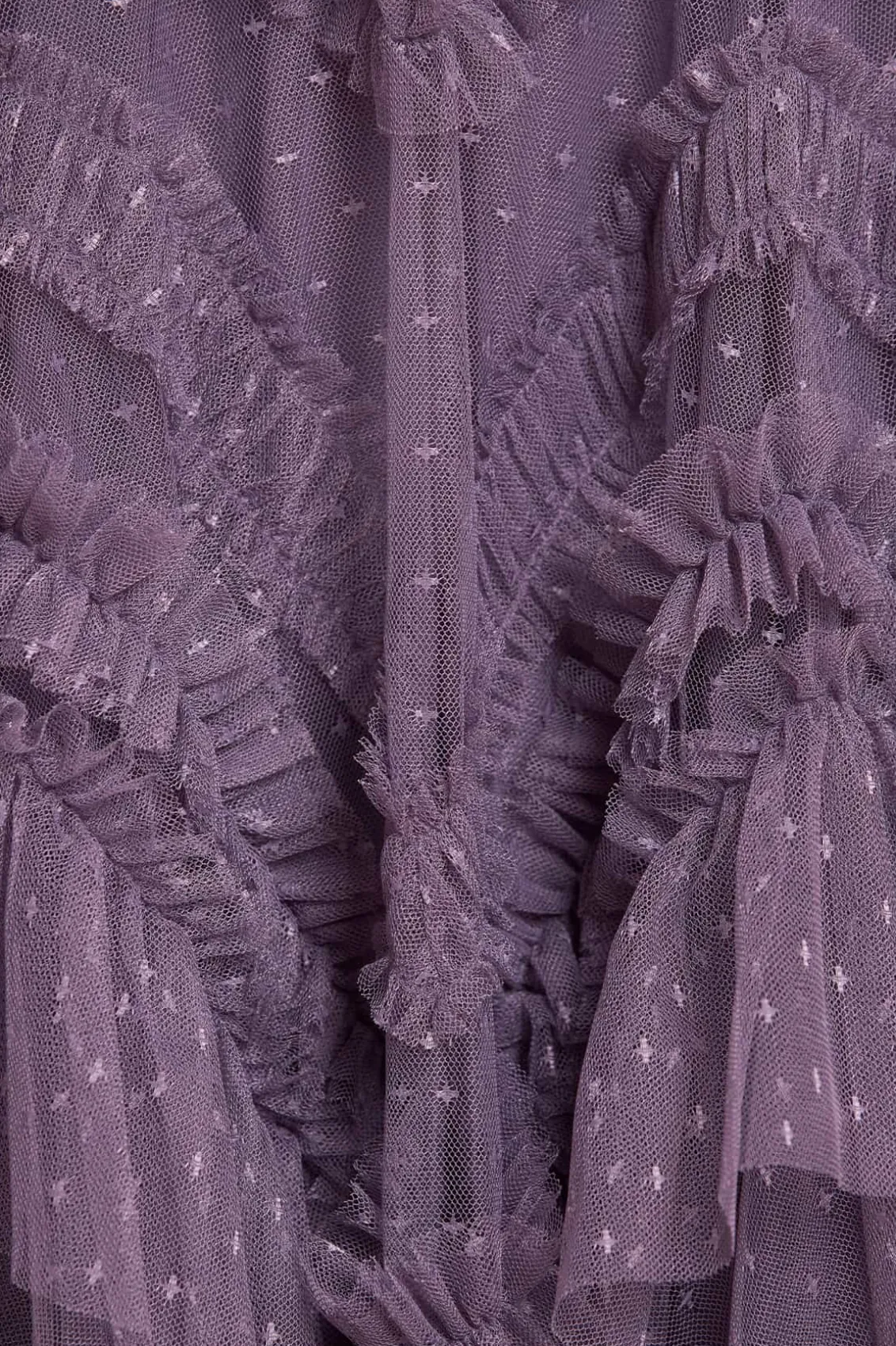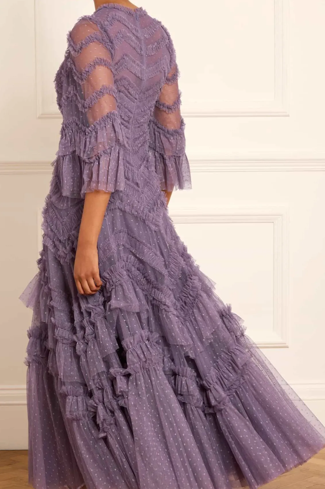 The Elia Long Sleeve Gown in Amethyst. This textile gown is beautifully designed with soft, delicate tulle ruffles that gradually increase in size towards the hem. Crafted with romantic, frothy fluted sleeves and developed using layers of soft tulle trimmed with frills, adding to this statement look. The skirt is made up of generous layers of net and tulle with a sweeping hemline. Expect all eyes on you in this statement style.