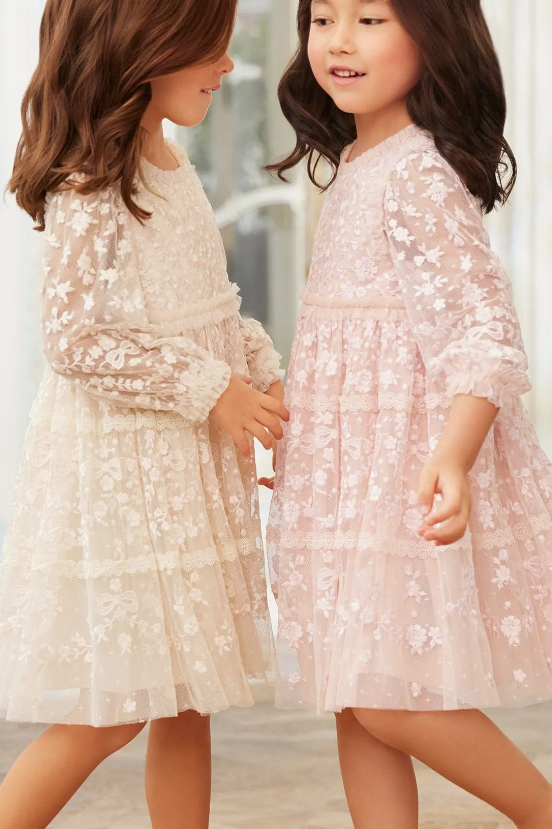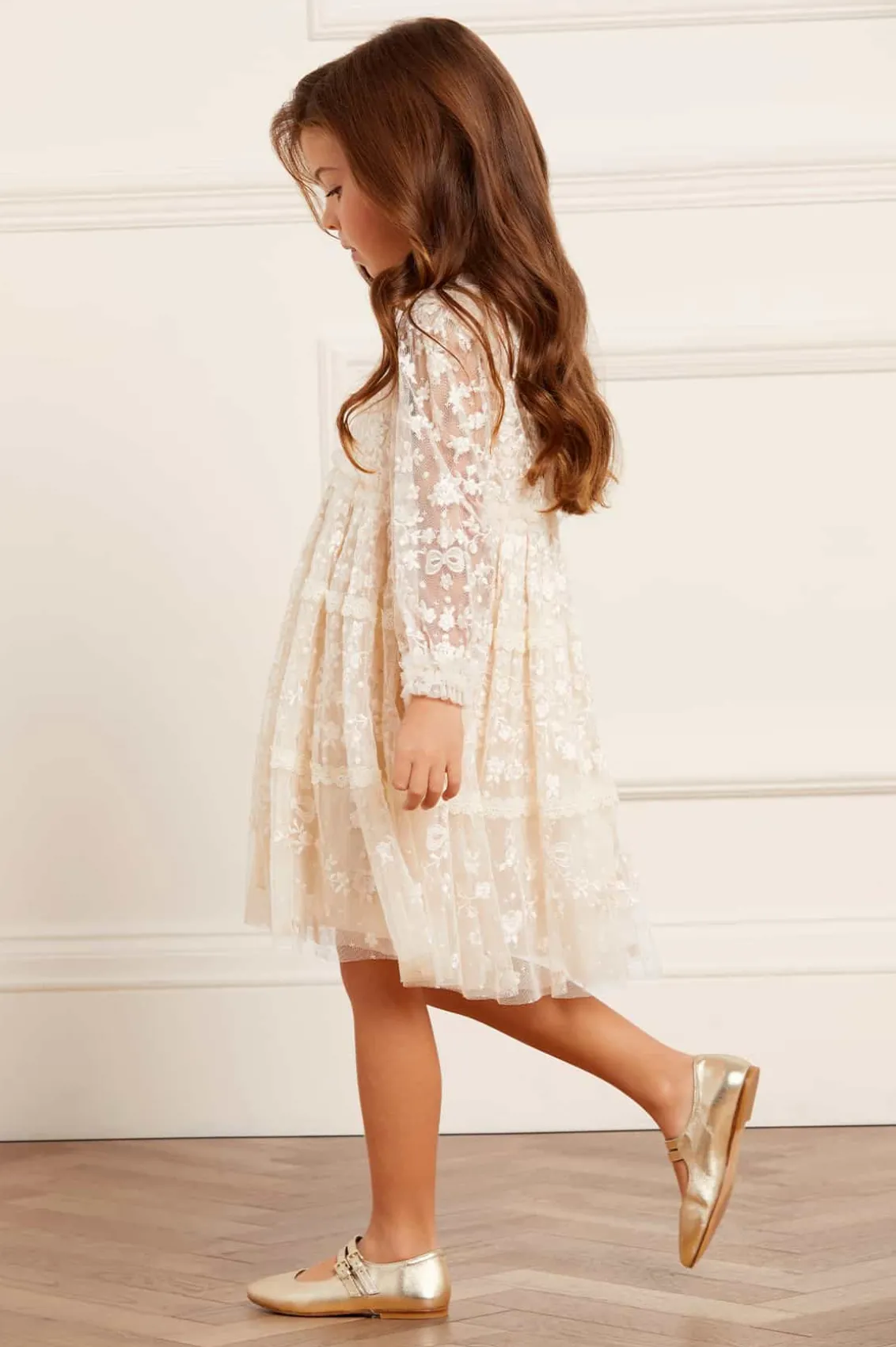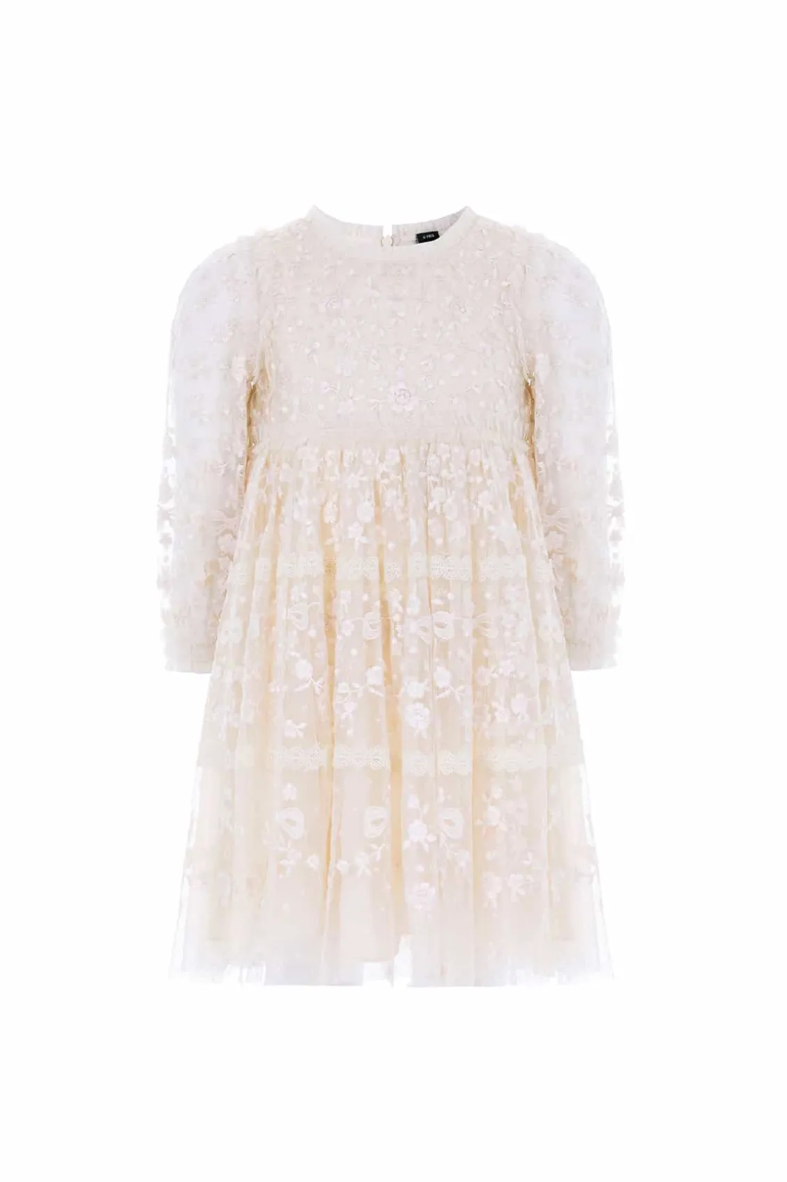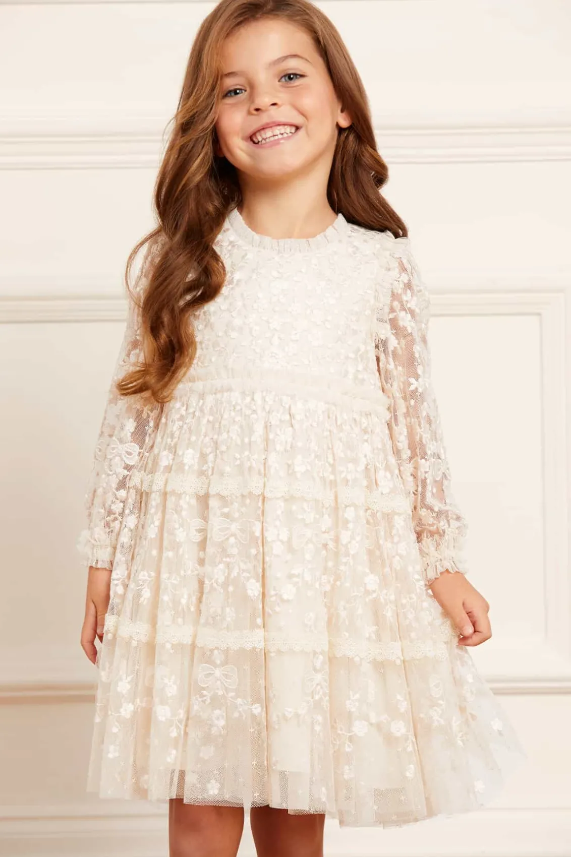 The Celestia Ribbon KIDS Dress in Champagne. This long sleeve dress is beautifully decorated with rich embroidery inspired by vintage lace, featuring delicate flower motifs and ribbon bows throughout. Intricately designed with lace trims for signature Needle & Thread detail. Crafted from a delicately textured tulle fabric base, with a playful tiered skirt for volume and movement. A truly magical piece.