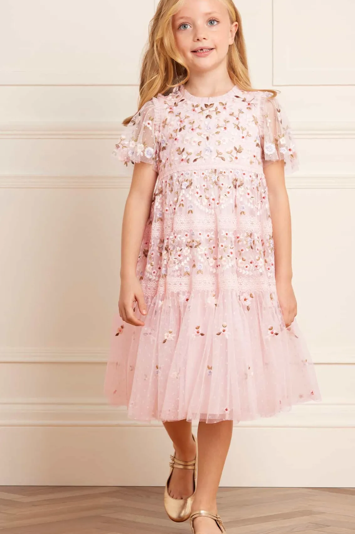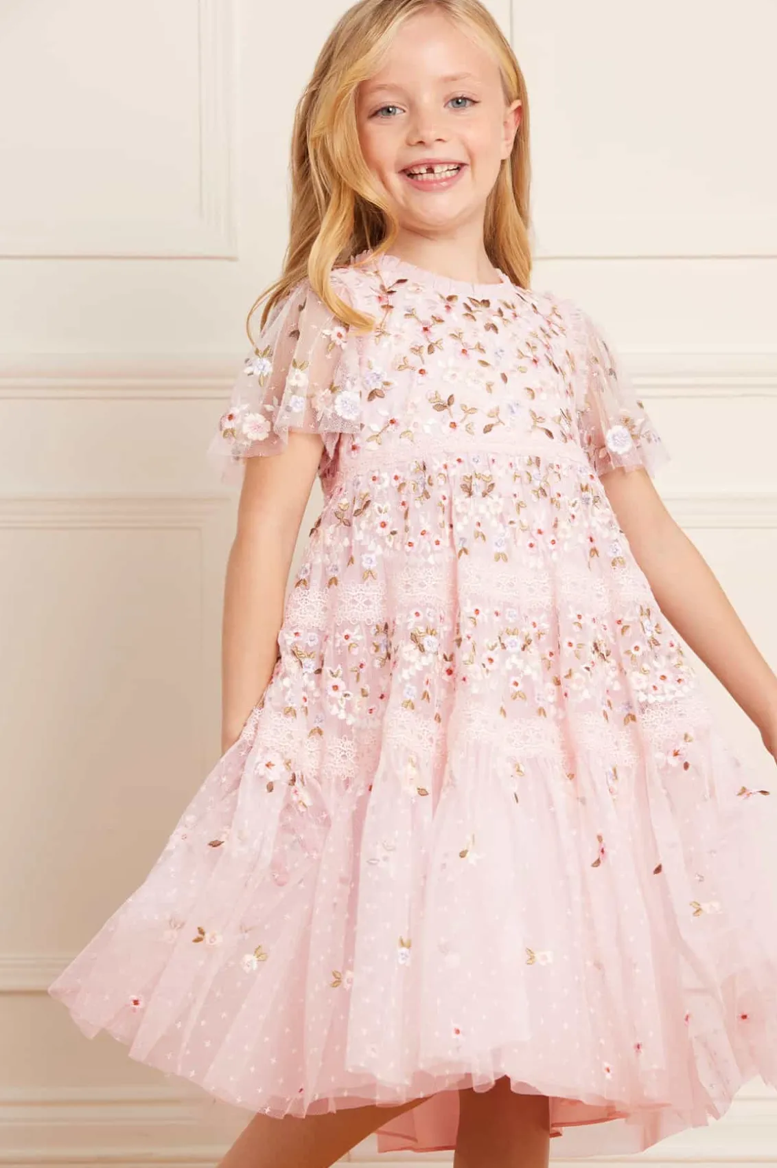 The Garland Ribbon KIDS Dress in Peony Pink. This dress is designed with embroidery inspired by Victorian lace trims. Featuring pretty intertwined lace borders in soft pastel floral motifs, accented by fresh white highlights. The skirt features tiers of fabric adorned with signature Needle & Thread detailing. The perfect fairytale piece for all your little one’s special occasions.