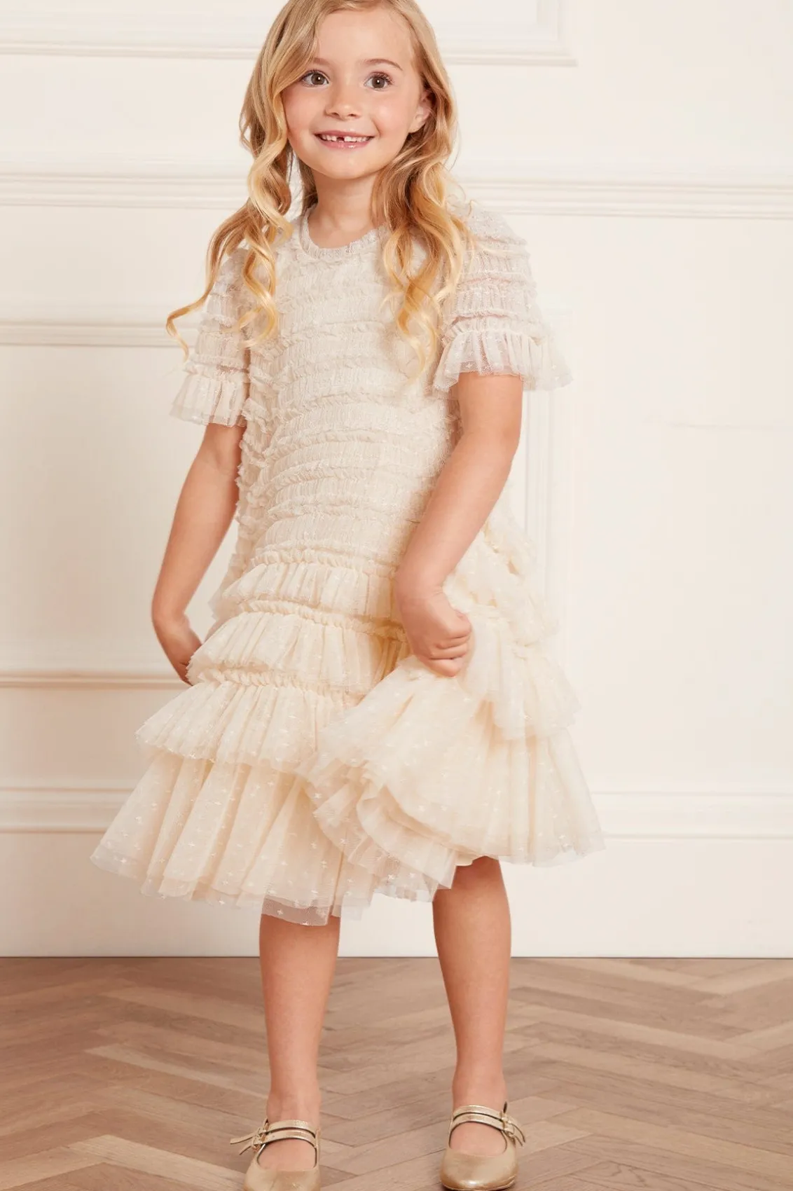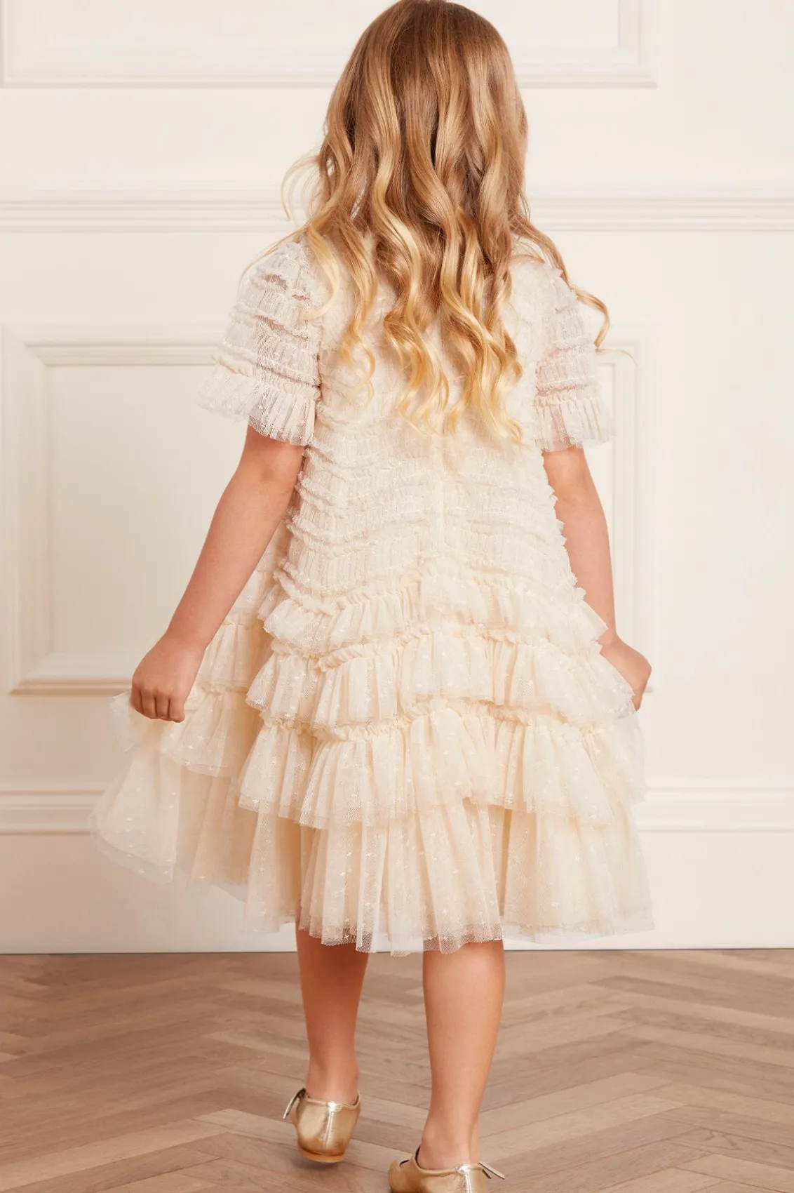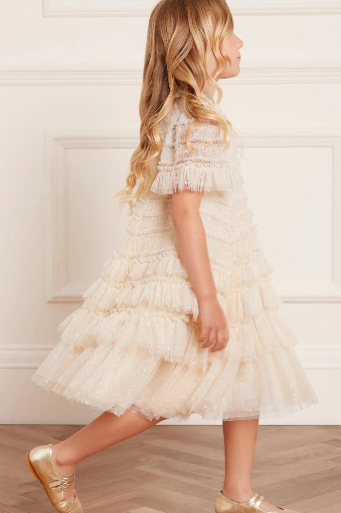 The Valentine Ruffle KIDS Dress in Champagne. This dress features a pretty floral bouquet print, taken from a 1900’s hand painted artwork. This signature Needle & Thread style is developed with ‘x’ kisses tulle and ruffles throughout. The ruffles are smaller around the neckline and bodice, increasing in size towards the hem to create playful volume. Let your little one make a statement in the Valentine.