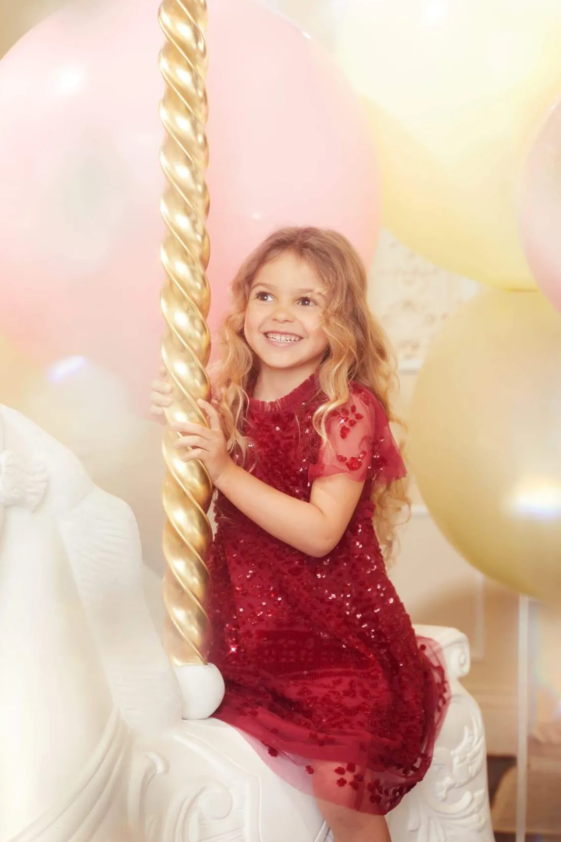 The Aurora KIDS Dress in Cherry Red. This light-catching dress is decorated with red shimmering sequins, inspired by a vintage lace tablecloth. This dress is crafted with short cap sleeves and pretty floral elements. Update your little one’s wardrobe with the ultimate fairytale dress of the season.