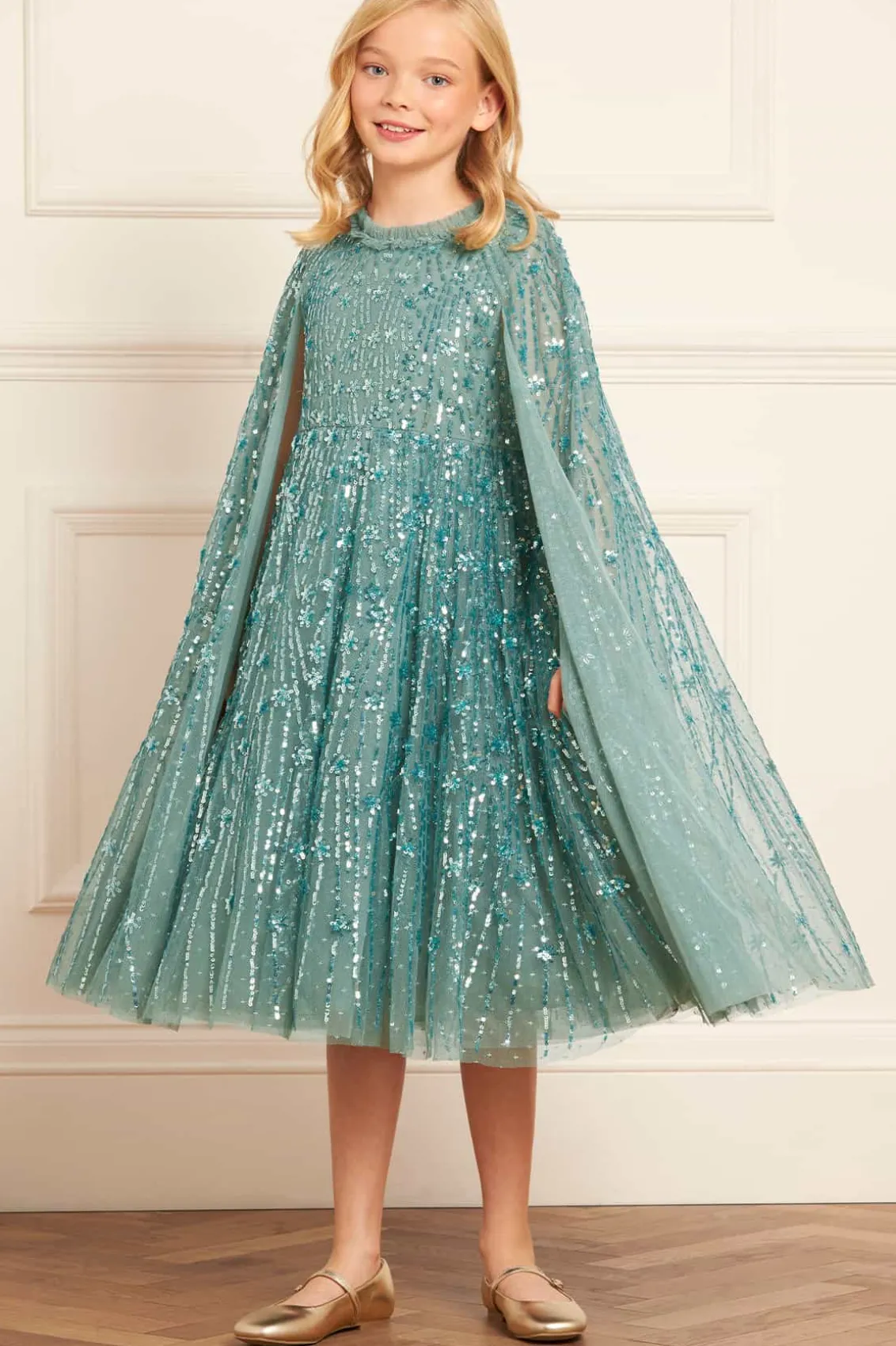 NEW SEASON. The Comet Cape Kids Dress in Aquamarine. This enchanting dress features shimmering sequin shooting stars, capturing the magic of a starlit sky. It’s perfect for twirling, designed with a statement full-length cape and a voluminous skirt of net and tulle. A fairytale-inspired piece that adds a touch of sparkle to your little one’s wardrobe.