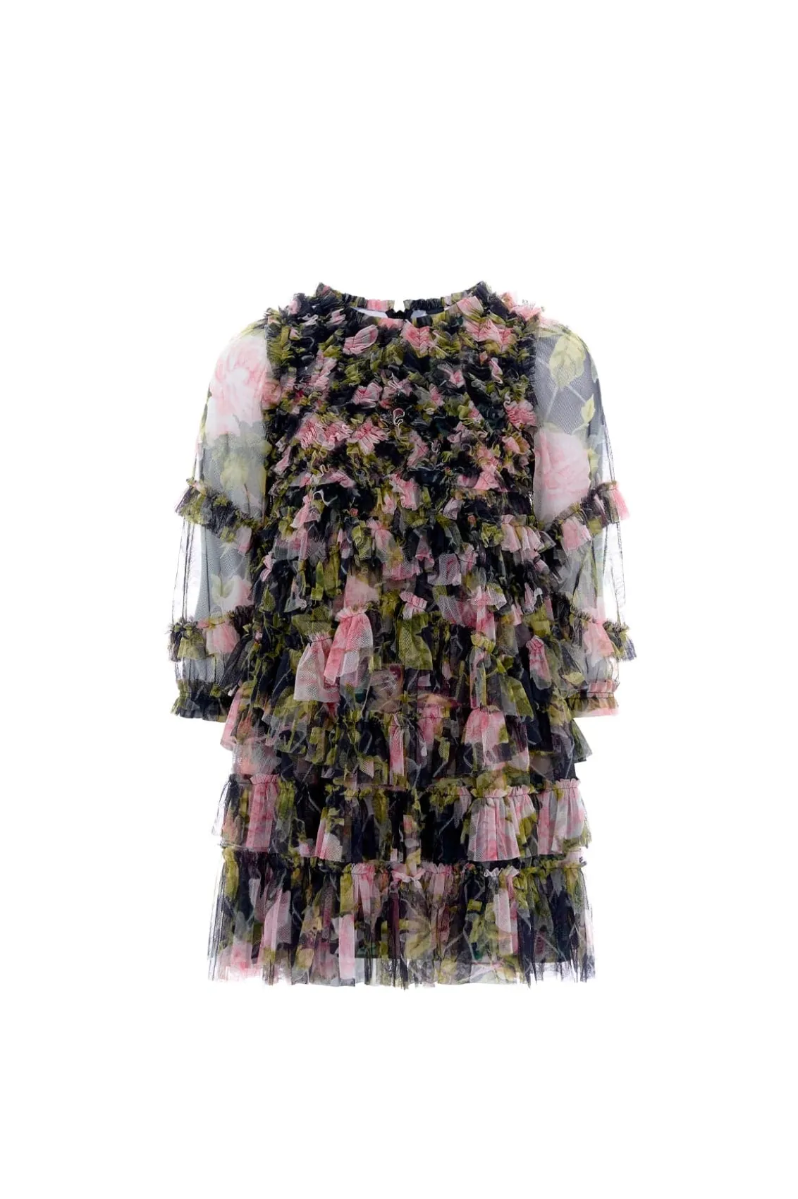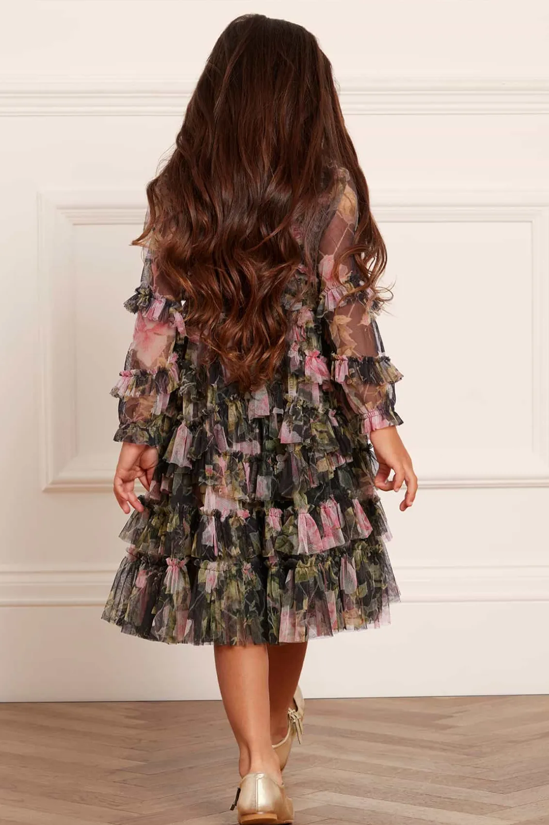 NEW SEASON. The English Rose Ruffle KIDS Dress in Graphite. This dress features a traditional rose print, inspired by a 1900’s hand-painted artwork. Engineered with delicate frills and developed in soft pink hues for a pretty, feminine look. Make the English Rose a new wardrobe favourite.