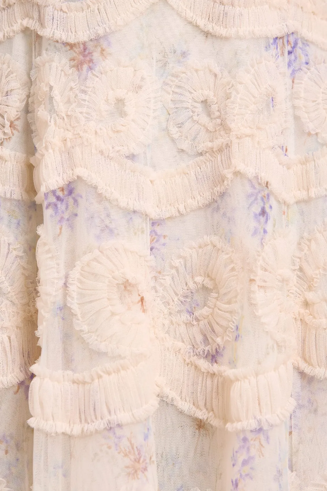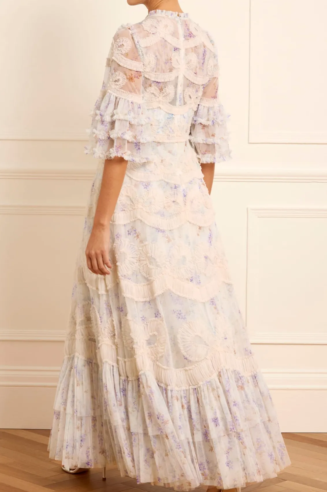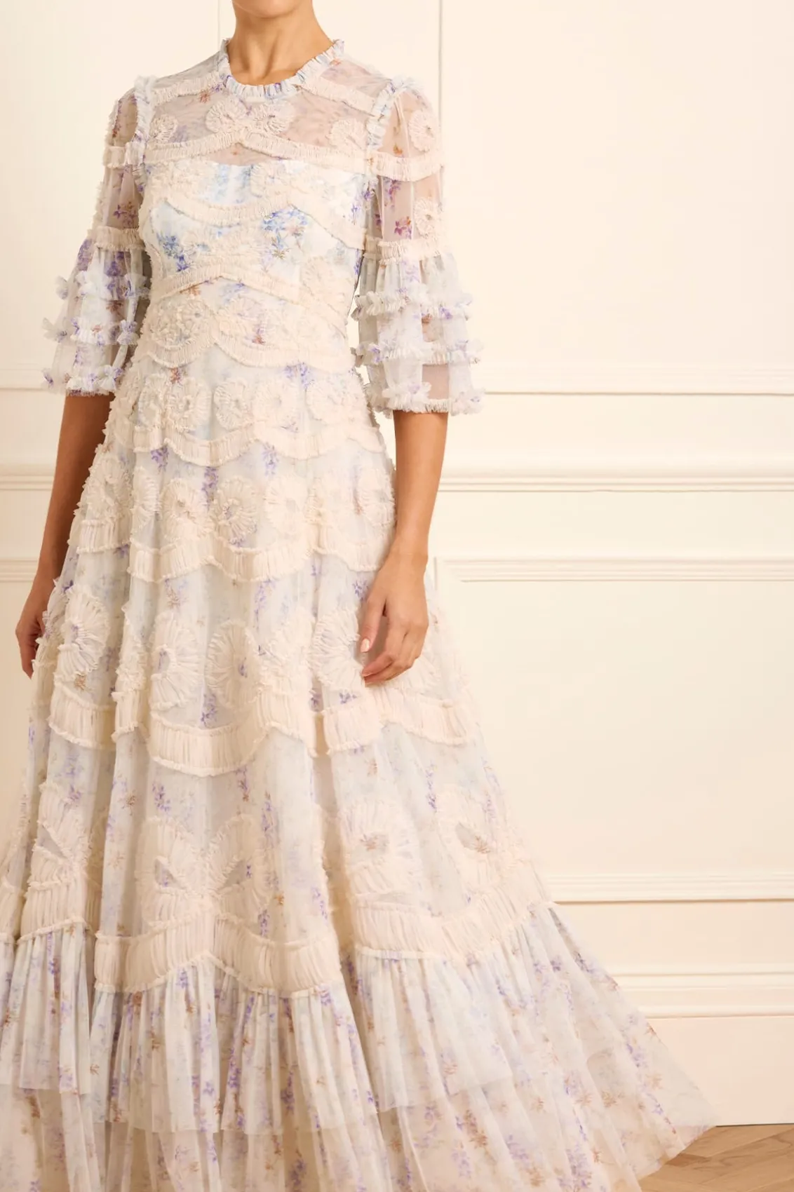 NEW SEASON. The Ophelia Ditsy Ingrid Gown in Moonshine/Blue. This beautiful, romantic trailing print was taken from an archive, and hand-painted artwork from the early 1900’s depicting soft whimsical ditsy, floating florals. This iconic Needle & Thread style is beautifully engineered with delicate tulle and subtle texture to capture this ribbon motif. A gown you’ll forever treasure.