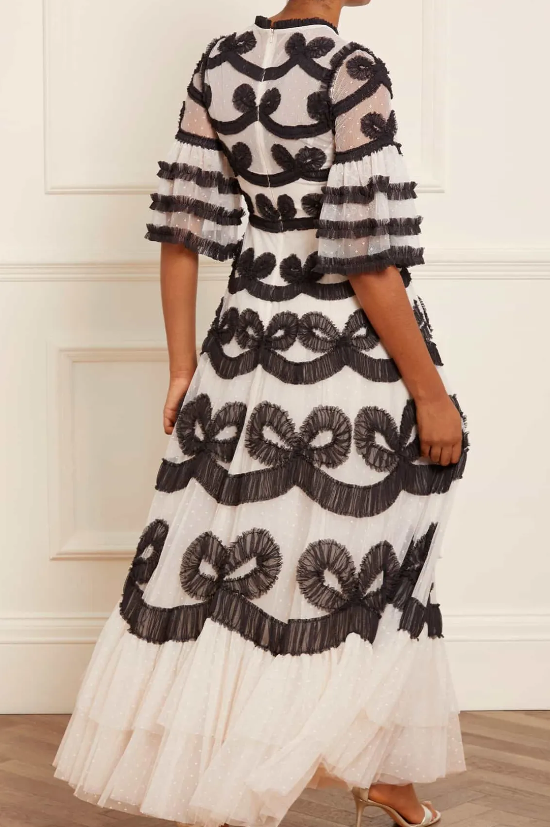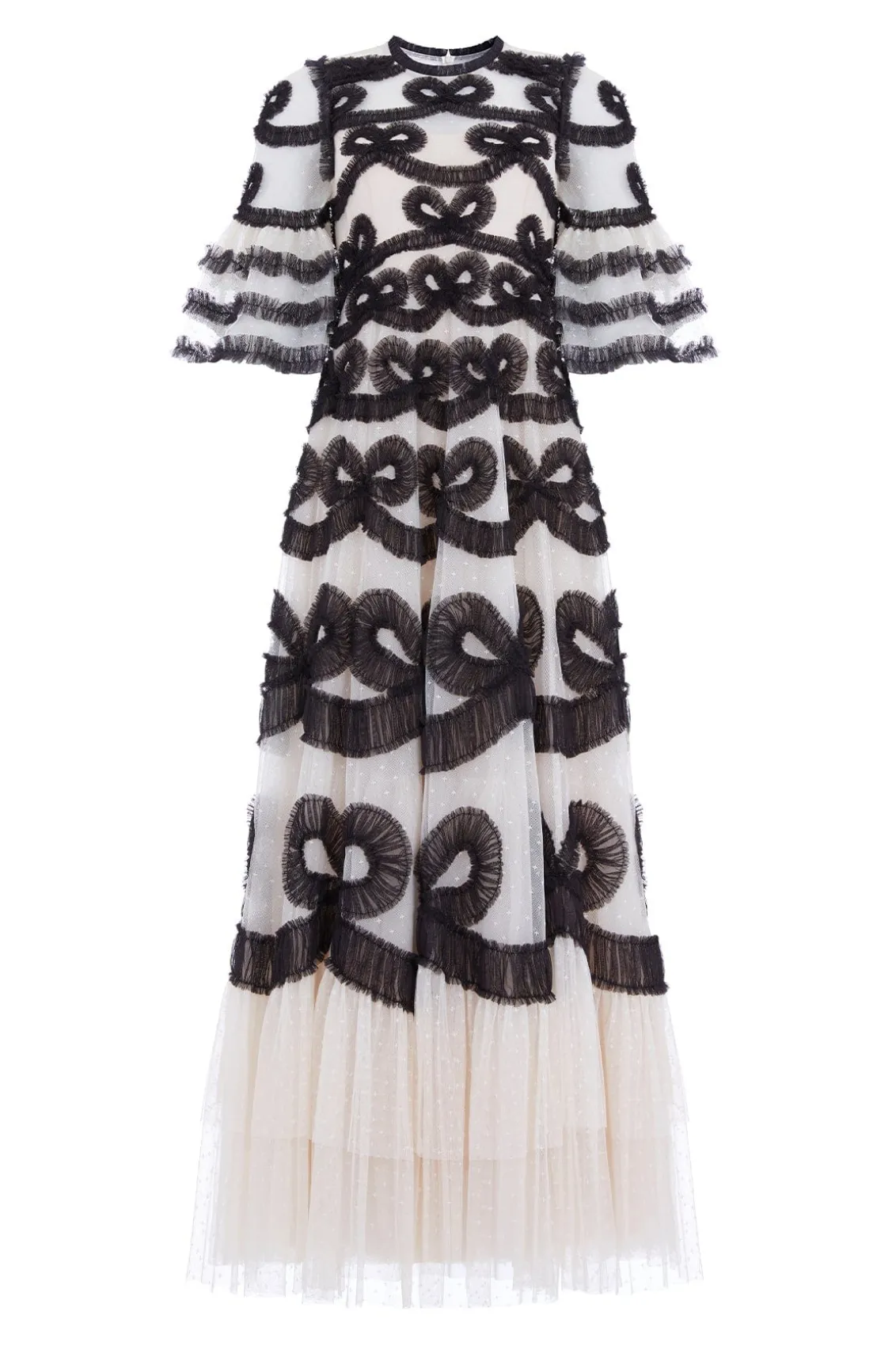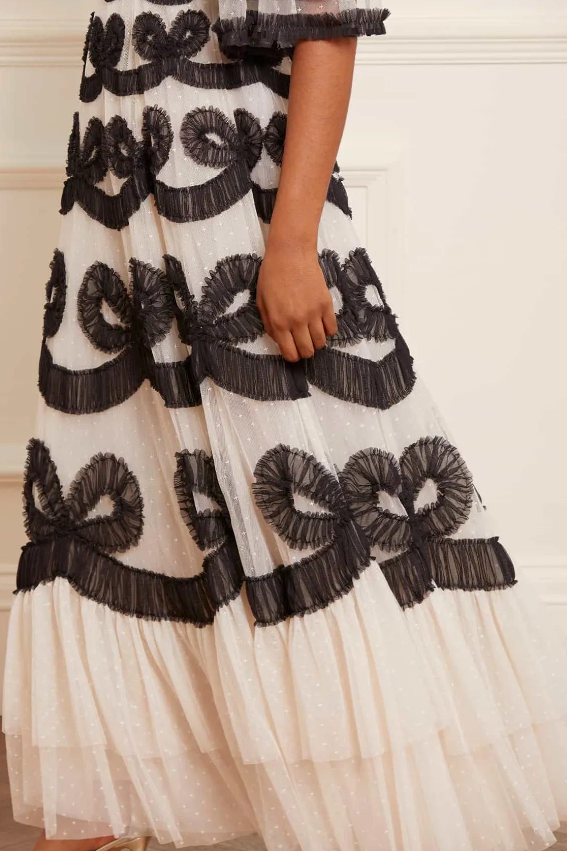 The Ingrid Gown in Cream / Graphite. This iconic Needle & Thread style is inspired by vintage ribbon bows. Beautifully engineered with delicate tulle and subtle texture to capture this ribbon motif. This signature Needle & Thread monochrome gown is bold yet truly romantic.