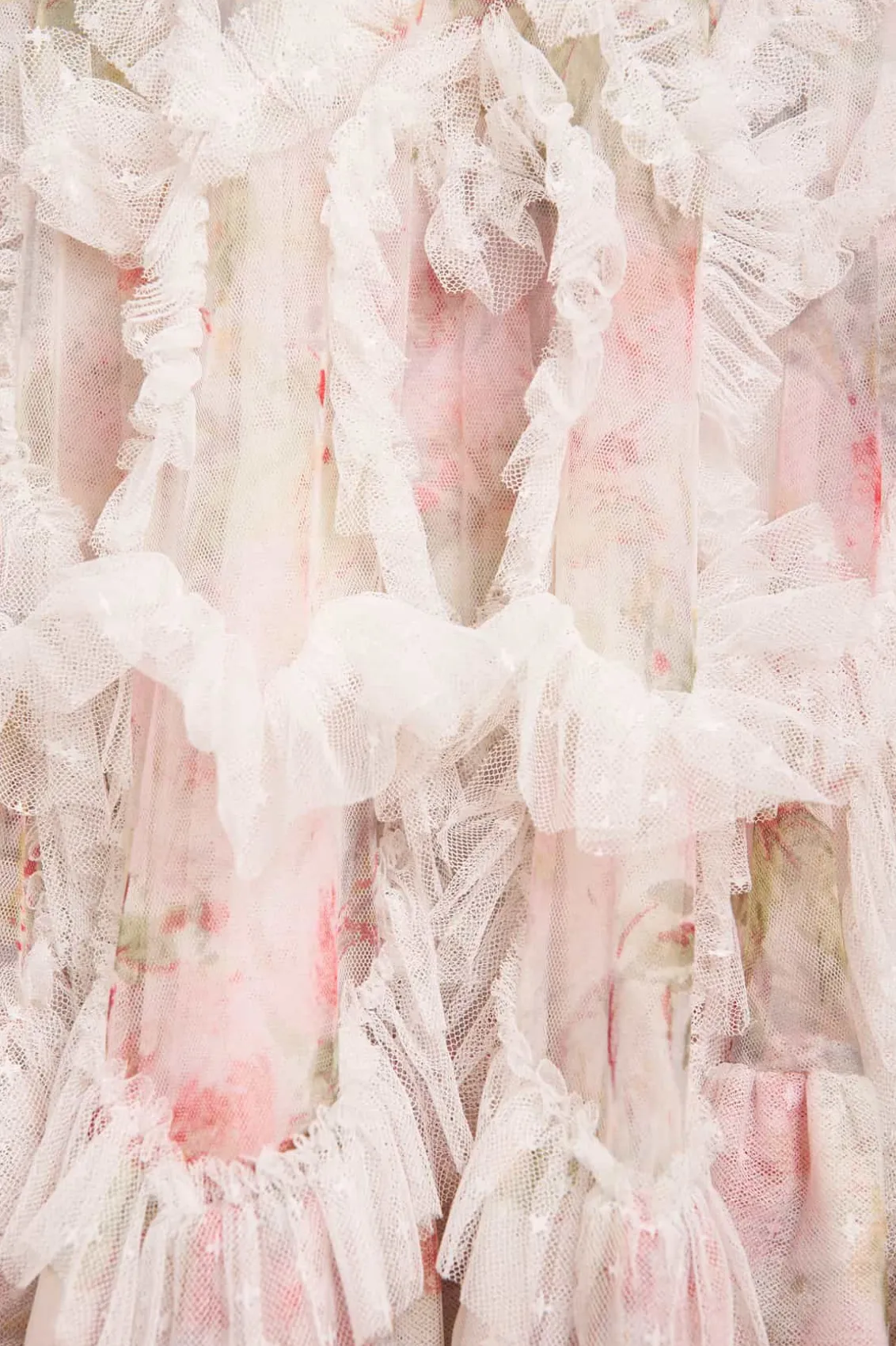 The Paradise Garden Amorette V-Neck Micro Mini Dress in Moonshine. The print of this dress is inspired by an enchanting paradise garden print, taken from an 1900s hand-painted artwork. This dress is designed with a luxe, twilight inspired colour palette in rich, lush floral motifs to create a truly alluring print. Beautifully adorned with our key love heart motif, made from gently gathered delicate tulle. Designed with romantic, frothy sleeves created using layers of delicate tulle and frills for a statement look. Featuring a generously, voluminous skirt layered with tulle and net for a magical silhouette. A textile piece you’ll forever treasure.