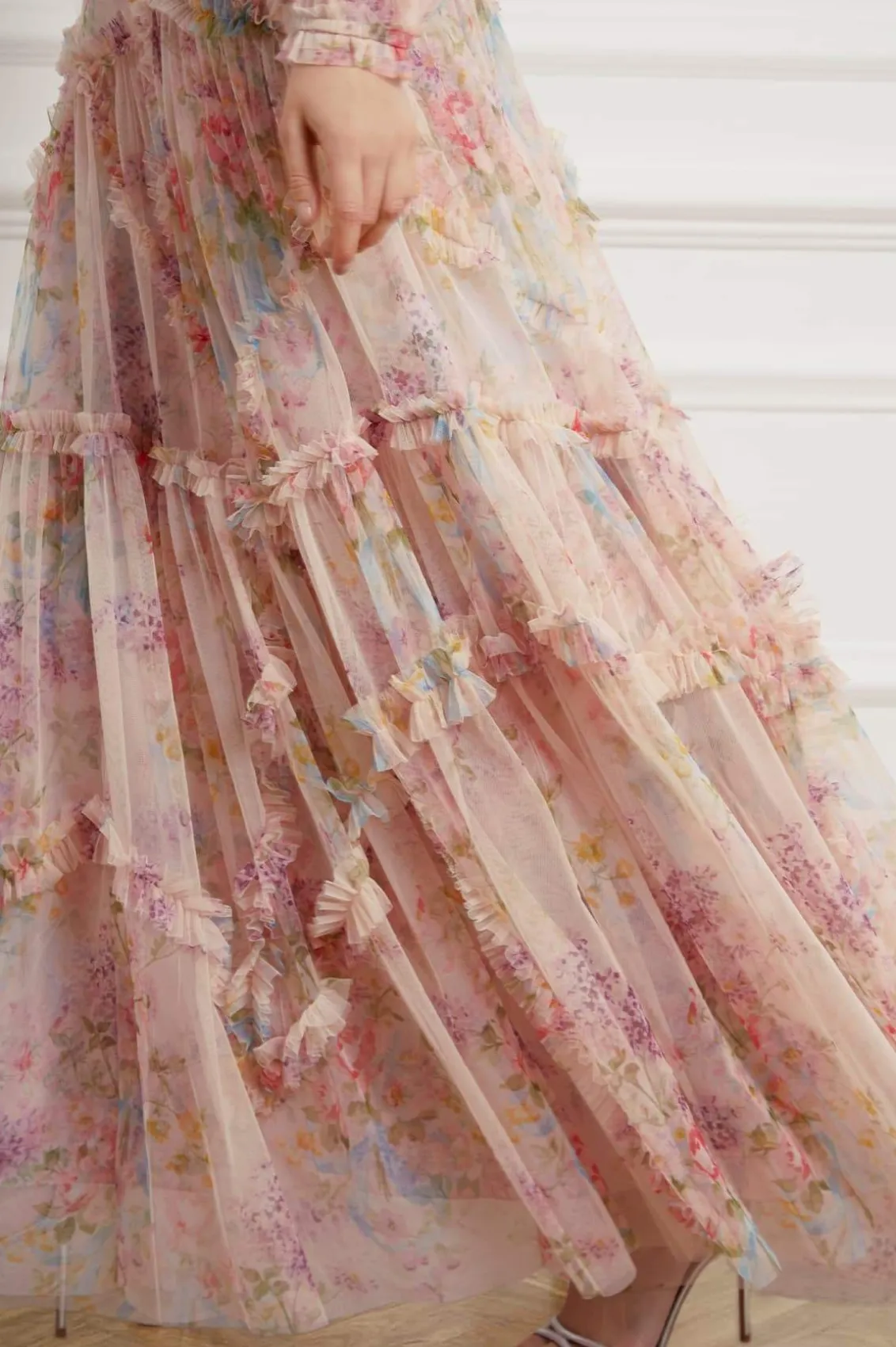 – Form fitted through the bodice with a relaxed fitting sleeve and a multi-tiered full skirt