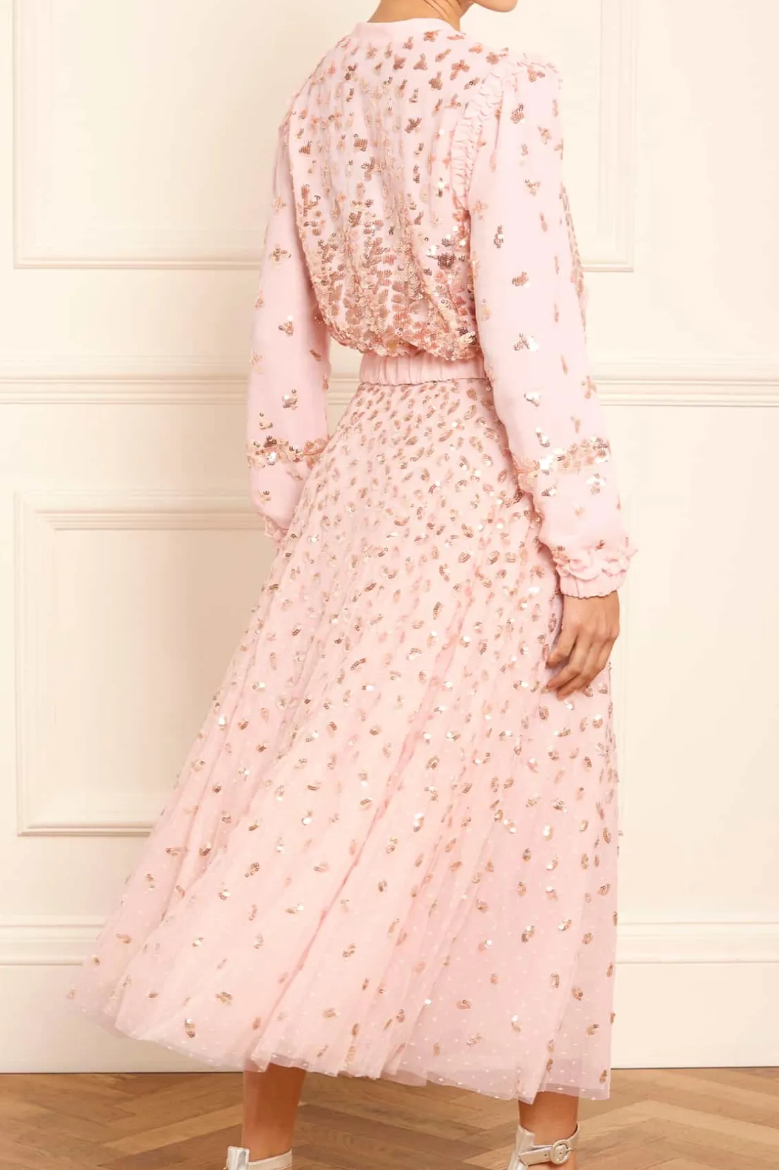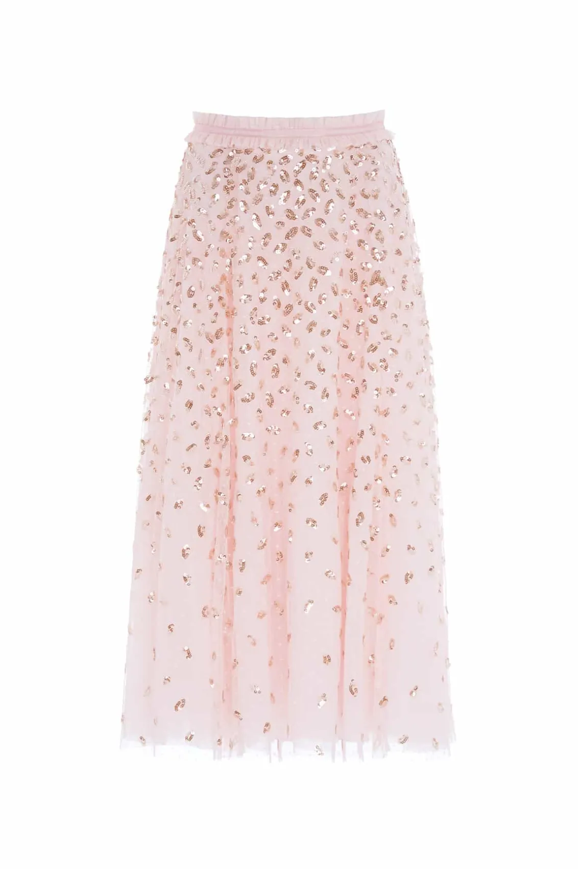 The Autumn Leaves Ballerina Skirt in Dusk Pink / Caramel. Our signature tulle skirt with a refresh for the season ahead. Needle & Thread are introducing decorated skirts into our new Autumn/Winter collection. This layered tulle skirt is developed with a generous hem sweep for movement. Beautifully designed with glistening leaf motifs scattered towards the hem to be reminiscent of falling autumn leaves. We recommend styling it with our bomber jacket for maximum impact.