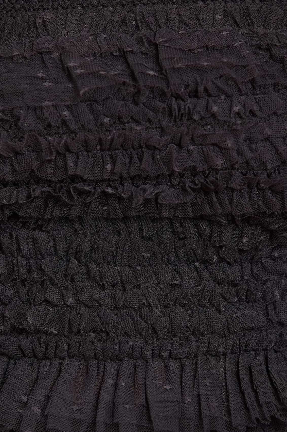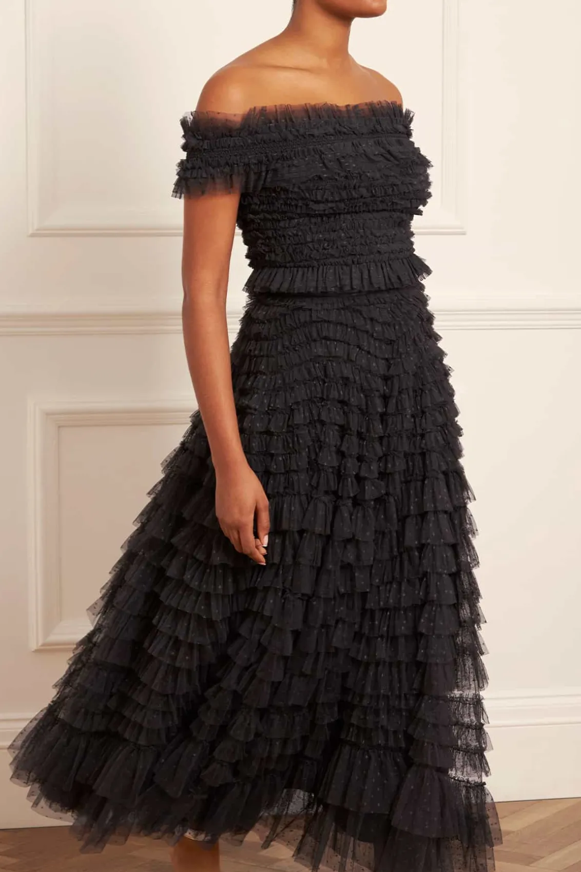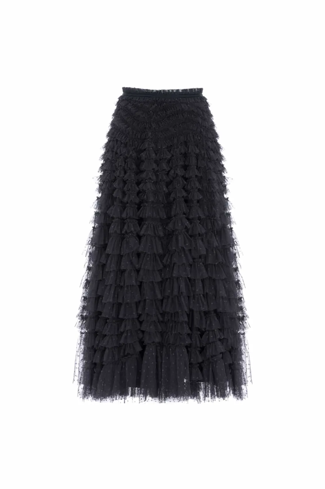 The Hattie Ruffle Skirt in Graphite. This textile skirt is engineered with layers of soft tulle and net to create a signature Needle & Thread style. Crafted with individual ruffles to create a beautiful, frilly texture. Designed with a sweeping hemline and finished at the waist with a satin ribbon for extra detail. We recommend pairing this skirt with our knitwear for a romantic Needle & Thread look.