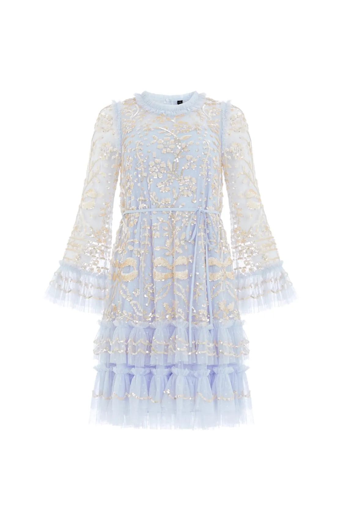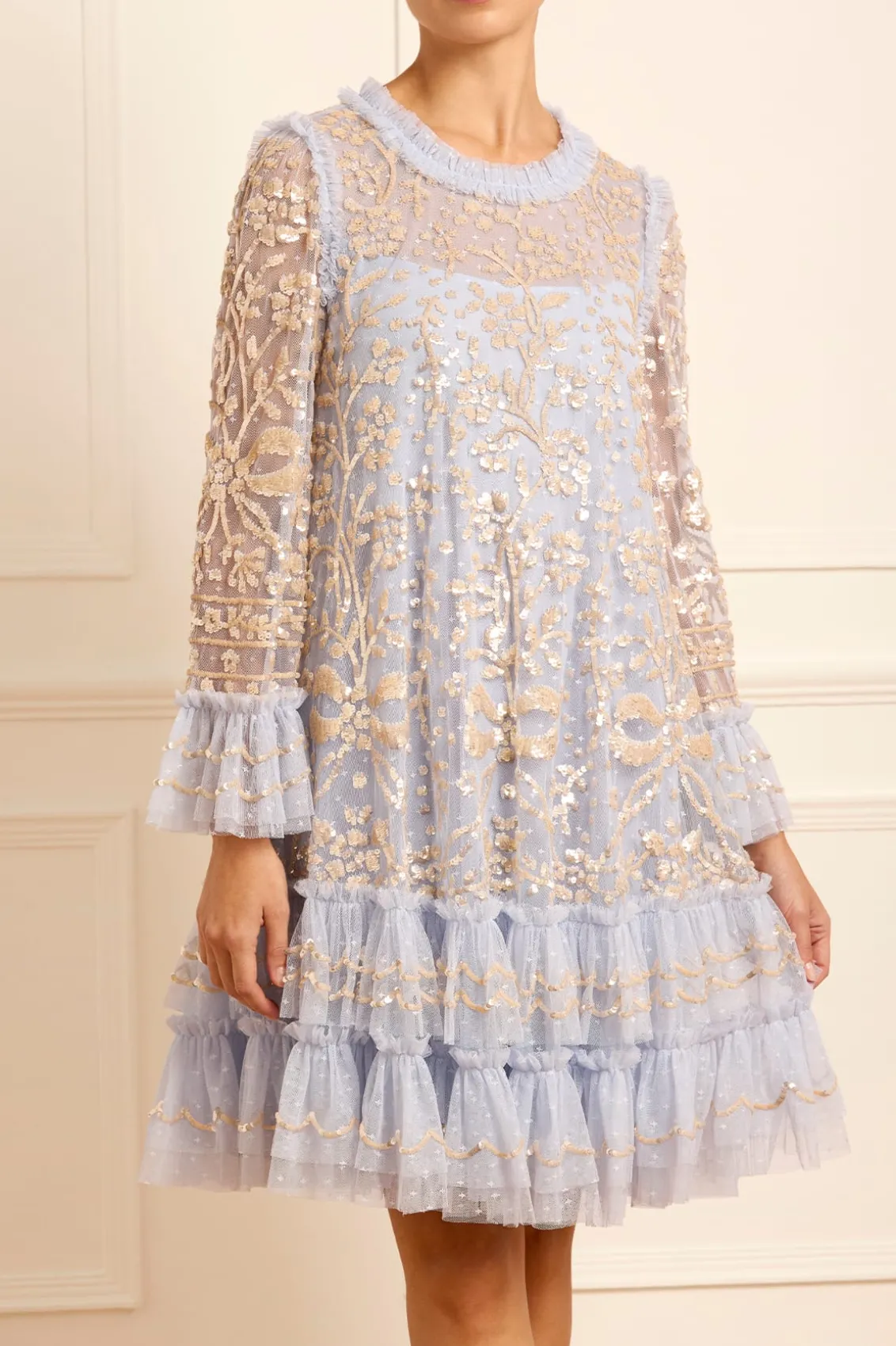 NEW SEASON. The Celia Long Sleeve Mini Dress in Dusk Blue/Gold. This statement dress is designed with romantic artwork featuring ornate florals and ribbon bows, densely embellished with shimmering sequins for exquisite detailing. Crafted with an effortless loose fit with soft, playful tulle frills on the hem and cuffs. A key piece in our collection.