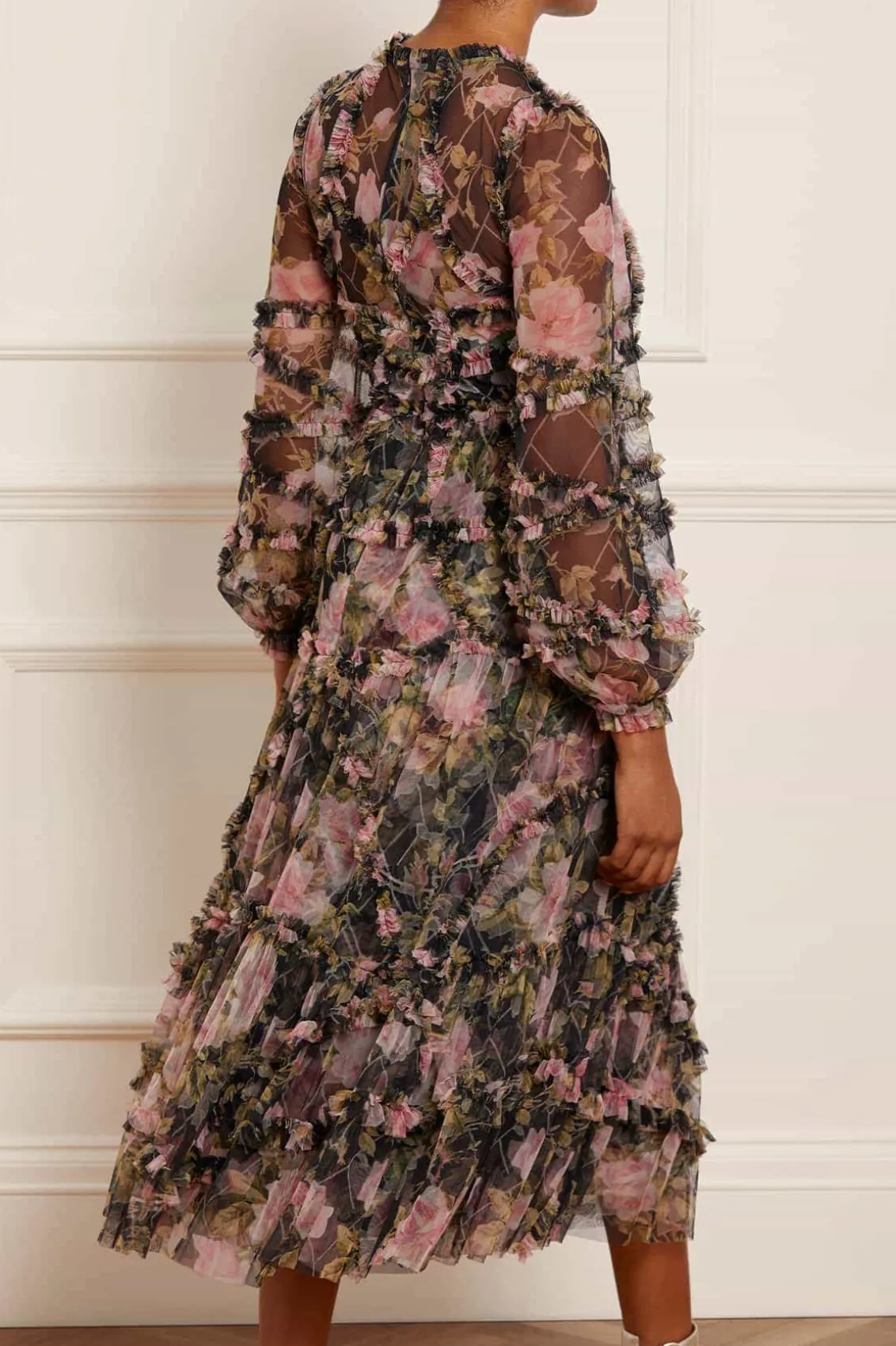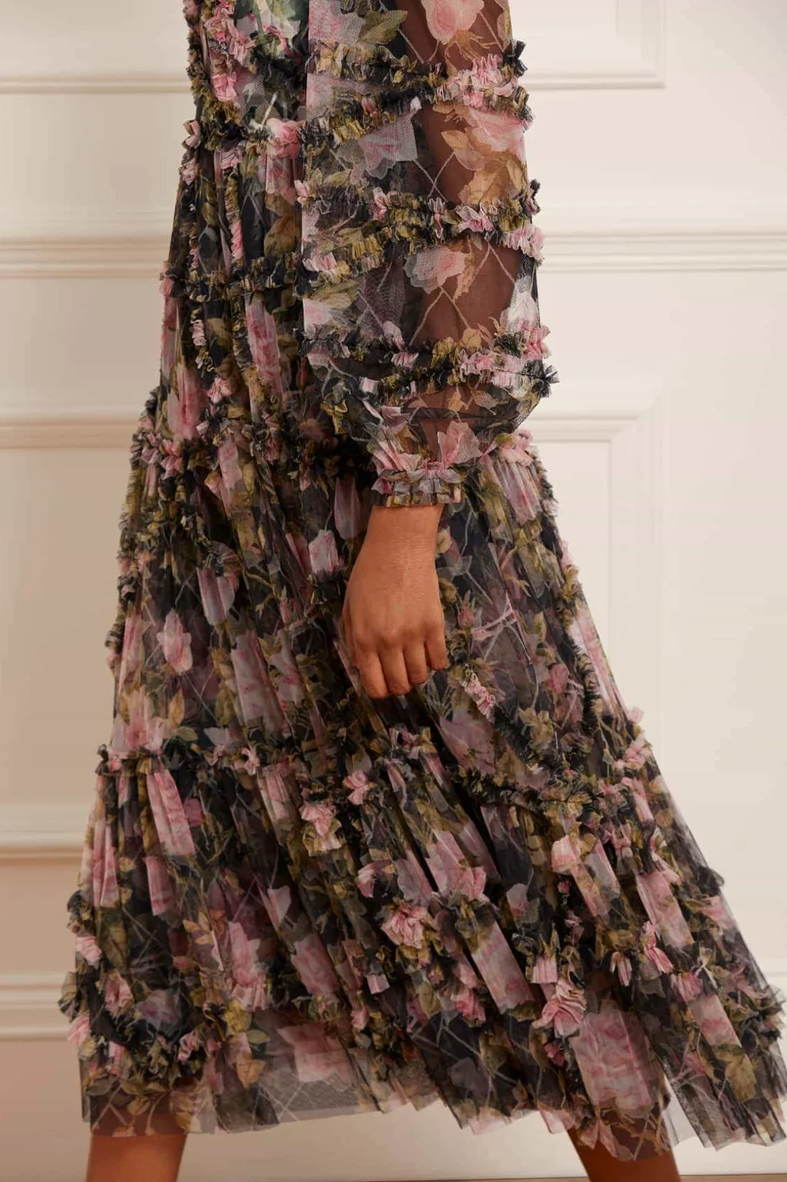 The English Rose Diamond Ruffle Ballerina Dress in Graphite. This ballerina dress is inspired by a traditional rose print taken from a 1900s hand-painted artwork, in soft hues of deep pinks. Developed with signature Needle & Thread styling featuring perfectly engineered frills for all-over delicate texture. The perfect dress to take you from dinner to the dancefloor.