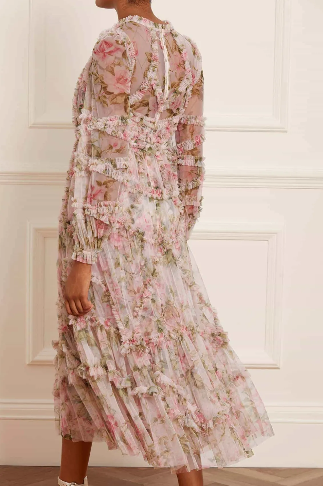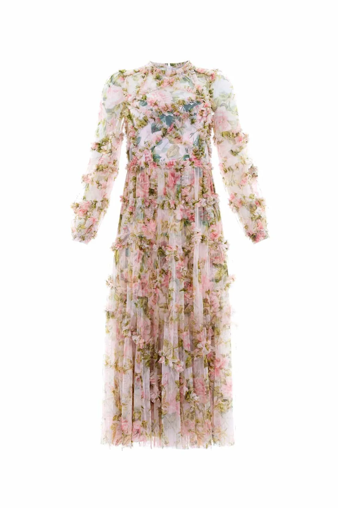 The English Rose Diamond Ruffle Ballerina Dress in Sky Pink. This ballerina dress is inspired by a traditional rose print taken from a 1900s hand-painted artwork, in soft hues of deep pinks. Developed with signature Needle & Thread styling featuring perfectly engineered frills for all-over delicate texture. The perfect dress to take you from dinner to the dancefloor.