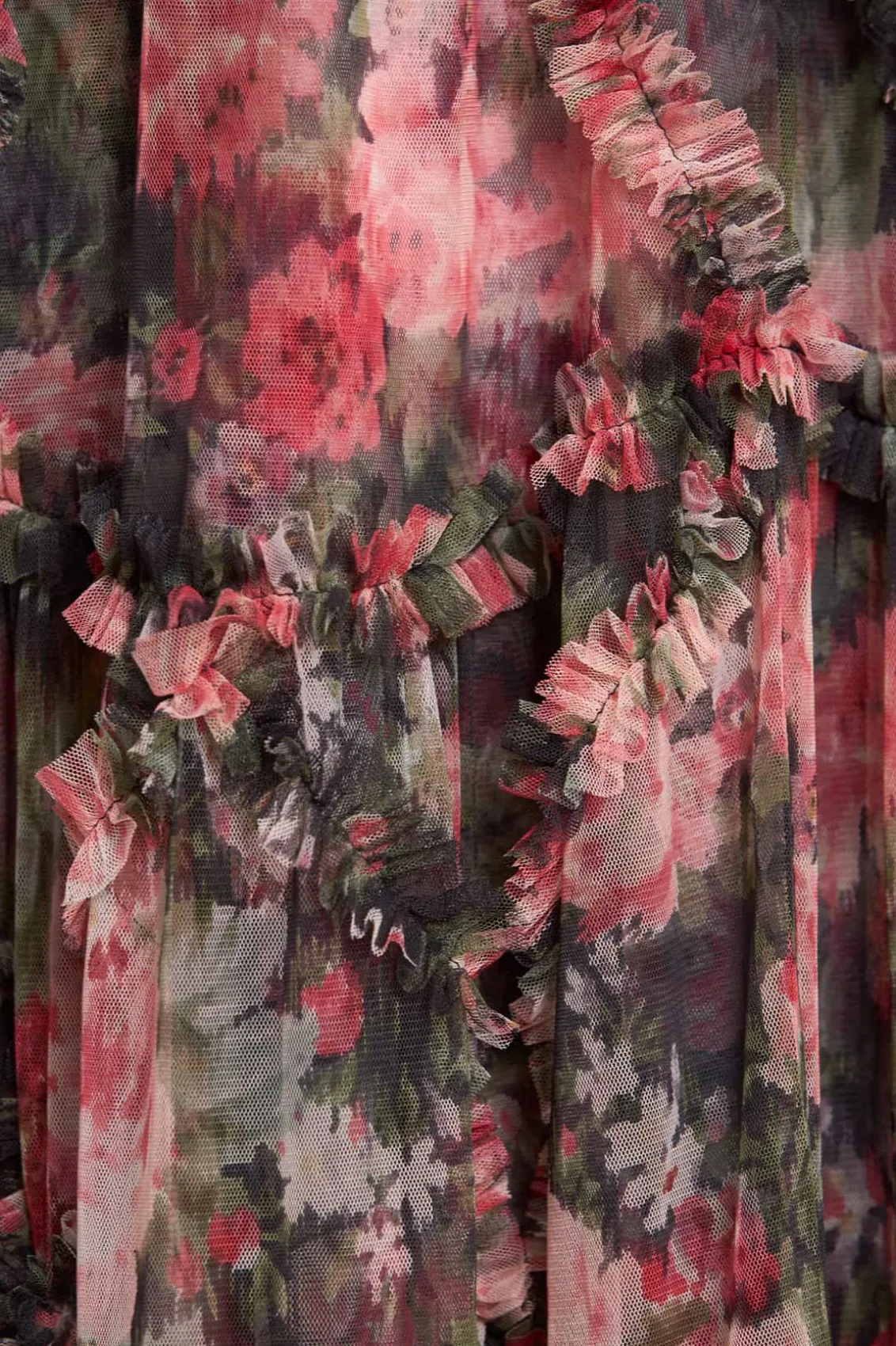 Midnight Dance Ruffle Ballerina Dress in Graphite. Beautifully printed with a floral design featuring luxurious blooms taken from archive, hand-painted artwork from the early 1900s. A romantic look featuring voluminous cuffed sleeves and a flattering skirt that skims the body to gently increase in fullness, creating stunning movement within the tulle. This Victorian-inspired look with a contemporary edge will be the star of your wardrobe.