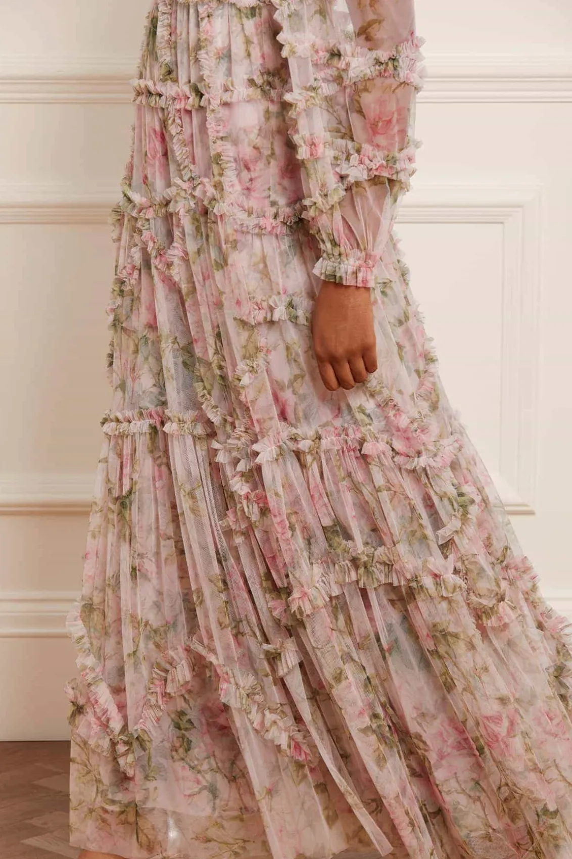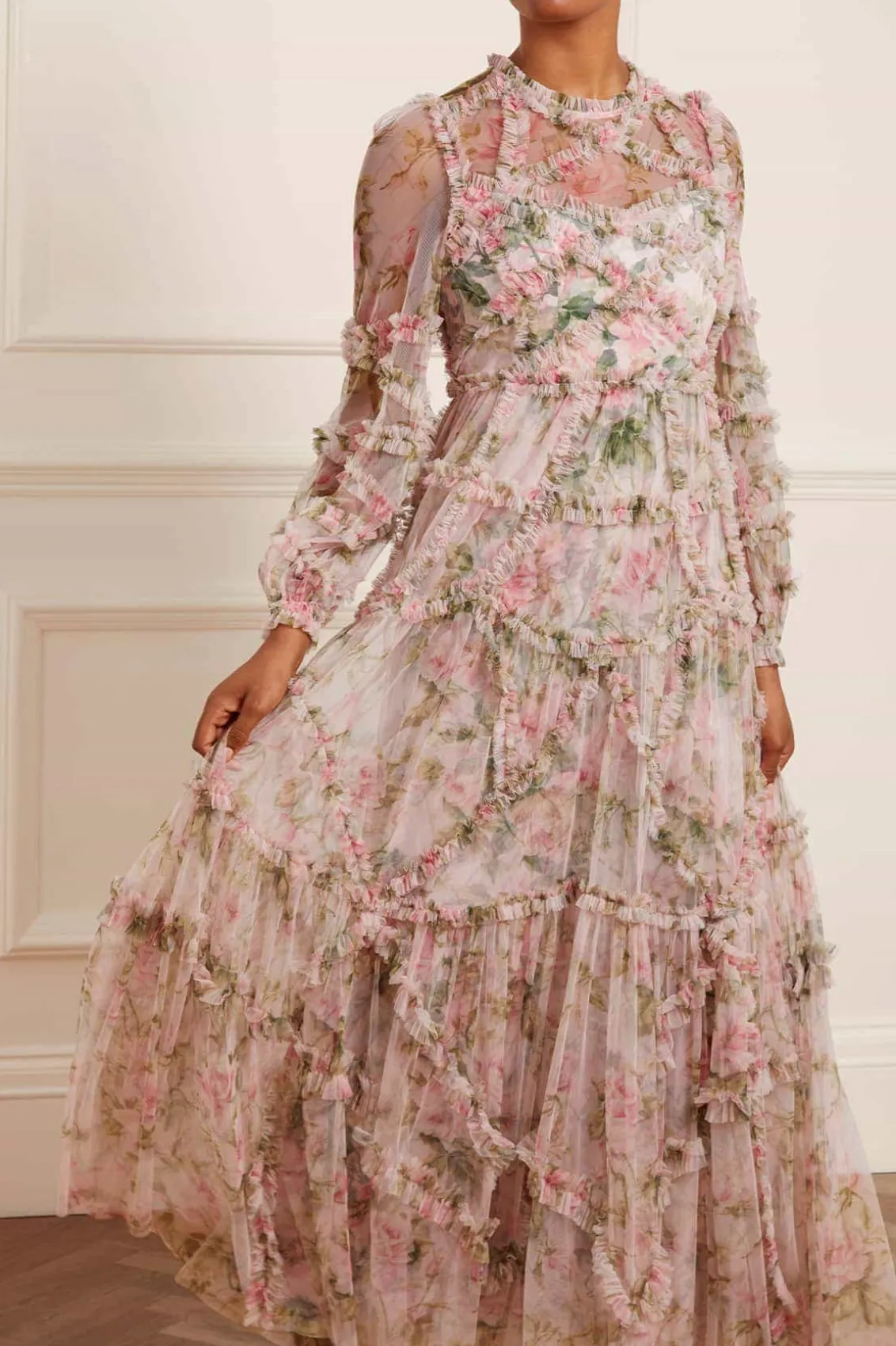 The English Rose Diamond Ruffle Gown in Sky Pink. This gown is inspired by a traditional rose print taken from a 1900s hand-painted artwork, in soft hues of deep pinks. Developed with signature Needle & Thread styling featuring perfectly engineered frills for all-over delicate texture. The perfect gown to take you from dinner to the dancefloor.