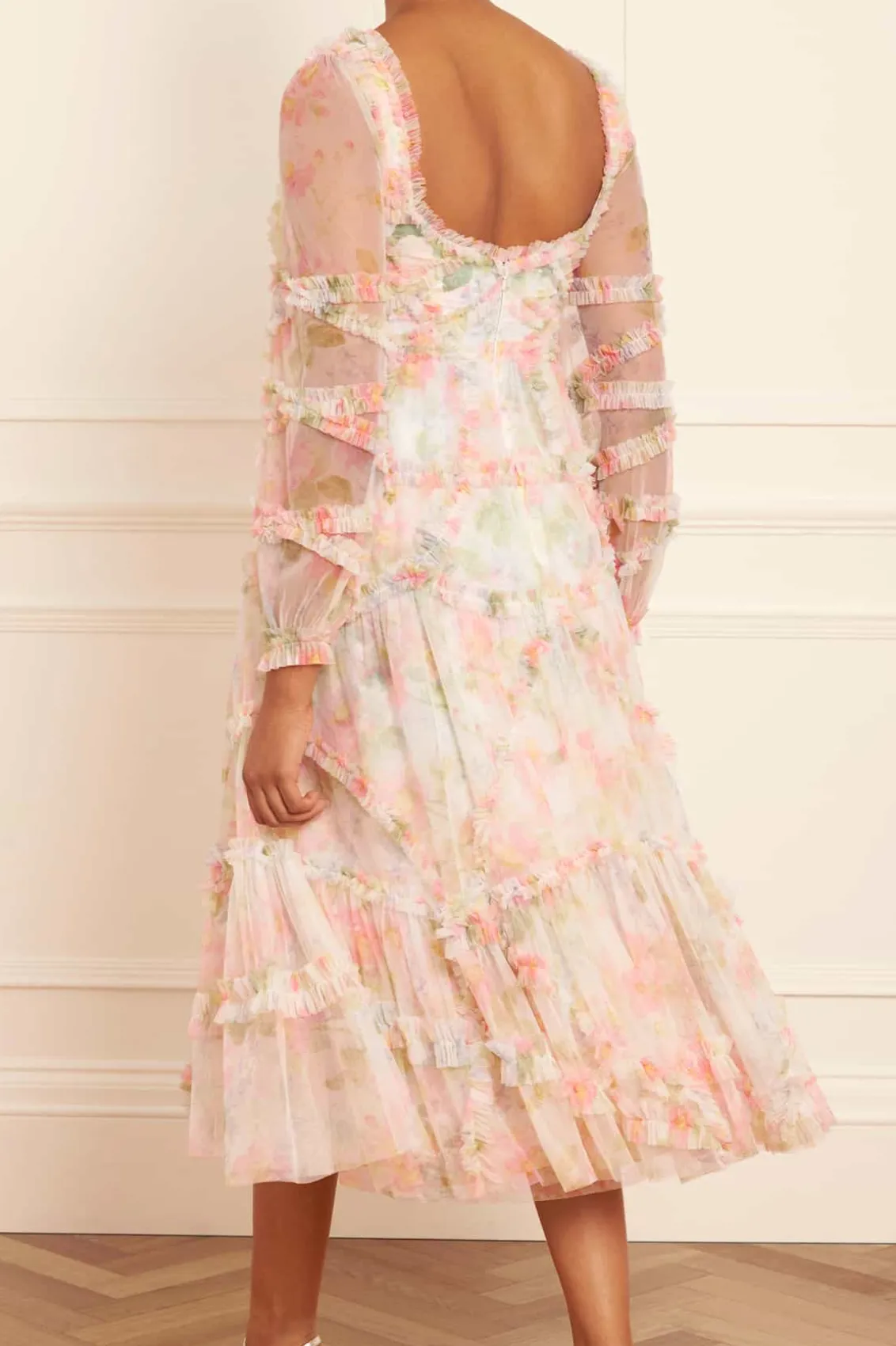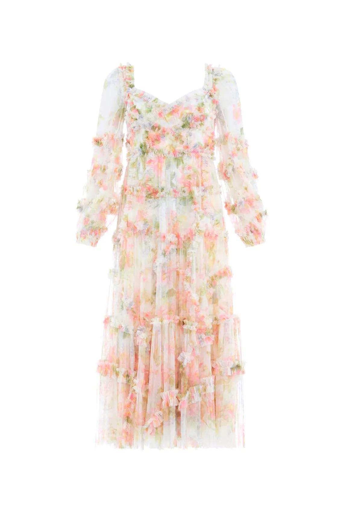 The Immortal Rose Maeve Long Sleeve Ballerina Dress in Moonshine. This beautiful dress features a romantic print captured from an antique, hand-painted artwork from the early 1900s. Decorated with wild rose motifs in soft pink shades intertwined with green foliage. Developed with our signature Needle & Thread textile tulle and gathered frills perfectly engineered around the body. The perfect dress for an upcoming special occasion.