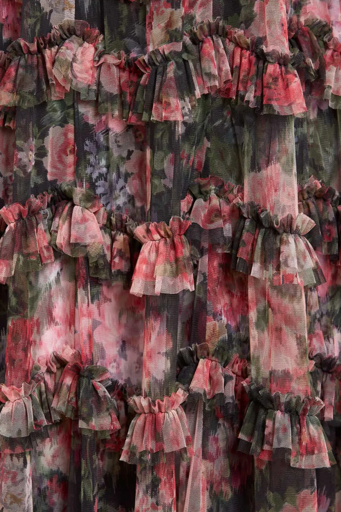 The Midnight Dance Round Neck Gown in Graphite. Beautifully printed with a floral design featuring luxurious blooms taken from archive, hand-painted artwork from the early 1900s. This style features pretty, engineered ruffle details perfectly positioned and inspired by Victorian styling. Crafted in signature Needle & Thread soft tulle for a romantic look. The skirt has a flattering fit that skims the body and gently increases in fullness, creating stunning movement within the tulle.