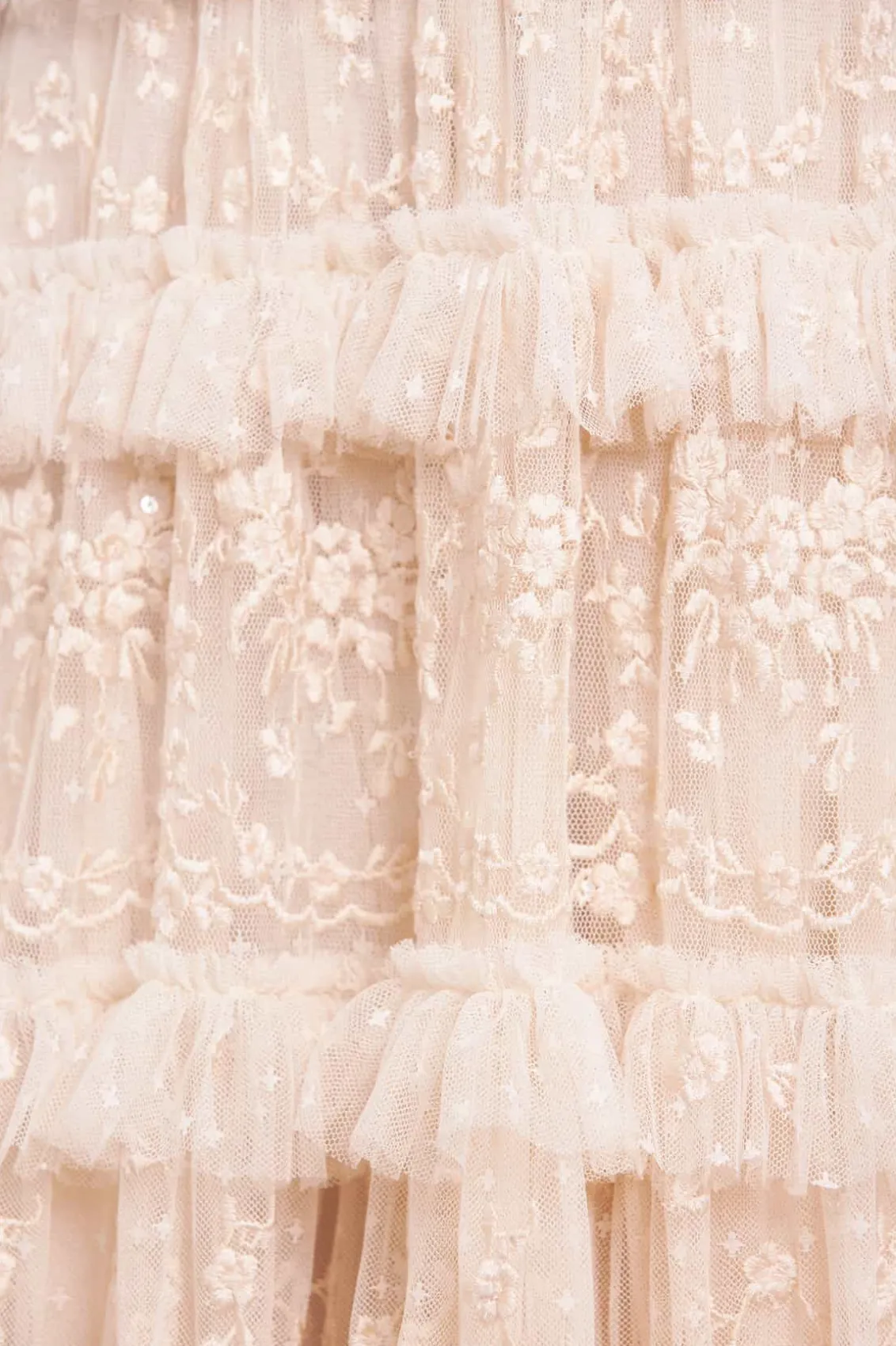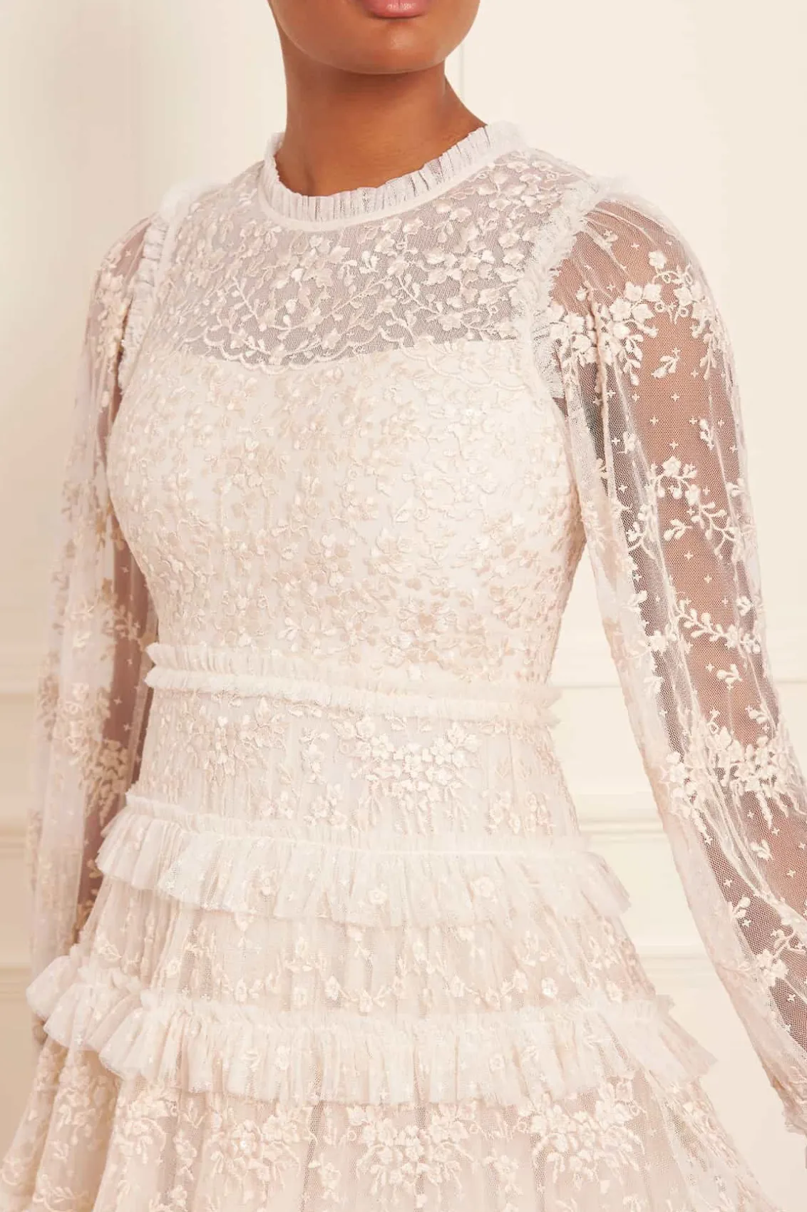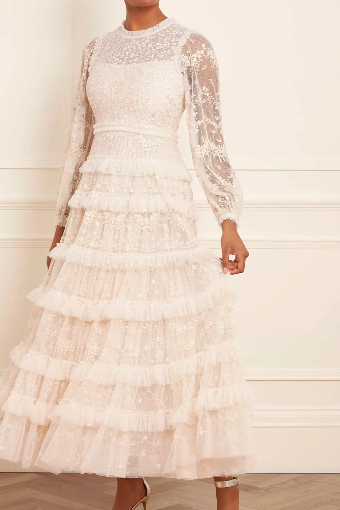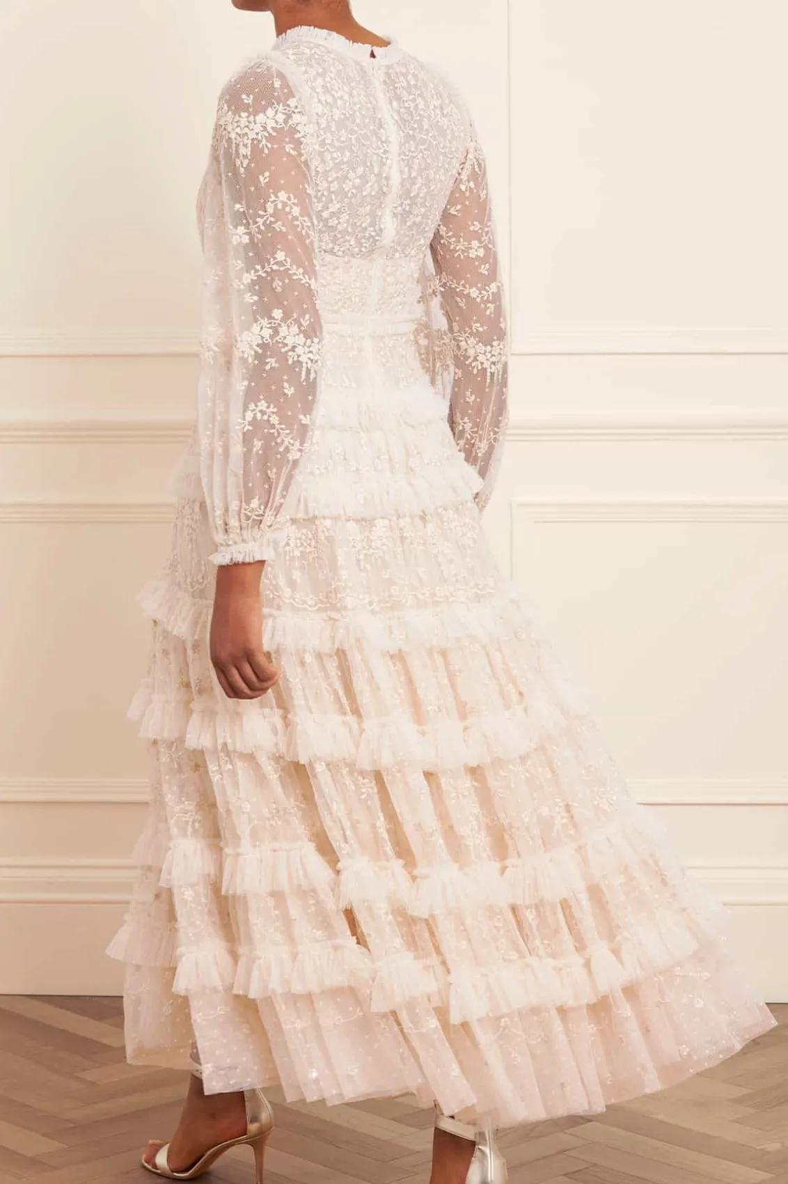 The Blossom Lace Ankle Gown in Cream. Designed with a voluminous silhouette and layered frills, this gown is beautifully decorated with intricate embroidery and subtle clear sequins. A statement piece with a net layer to accentuate its dramatic silhouette. A truly show-stopping style.