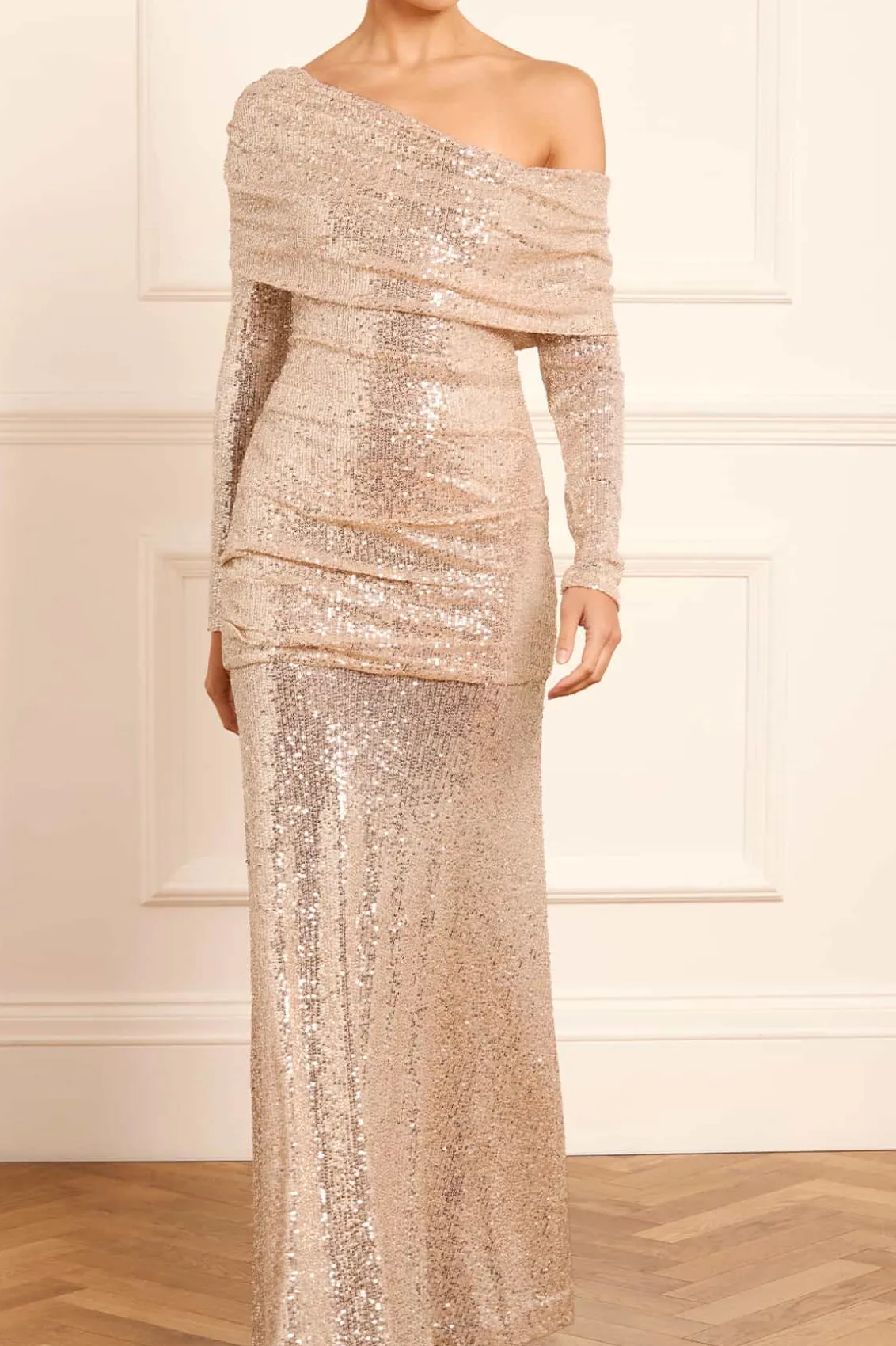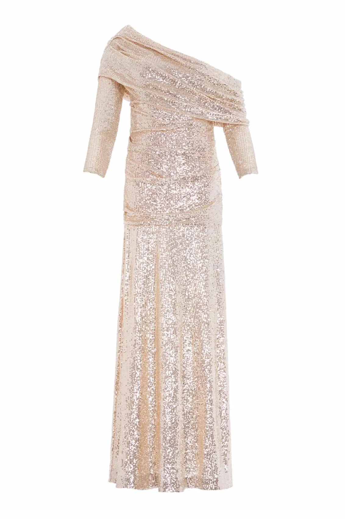 The Nova One-Shoulder Ankle Gown in Silver. This gown is inspired by vintage Hollywood glamour. Beautifully designed with an elegant off-the-shoulder structure. Adorned all over with tiny glittering sequins for the ultimate statement. Crafted with a slim silhouette enhanced by soft drapes across the body, leading to a fluid sweeping skirt. The perfect romantic style for an upcoming special occasion. We hope you adore this new style as much as we do at Needle & Thread head office.