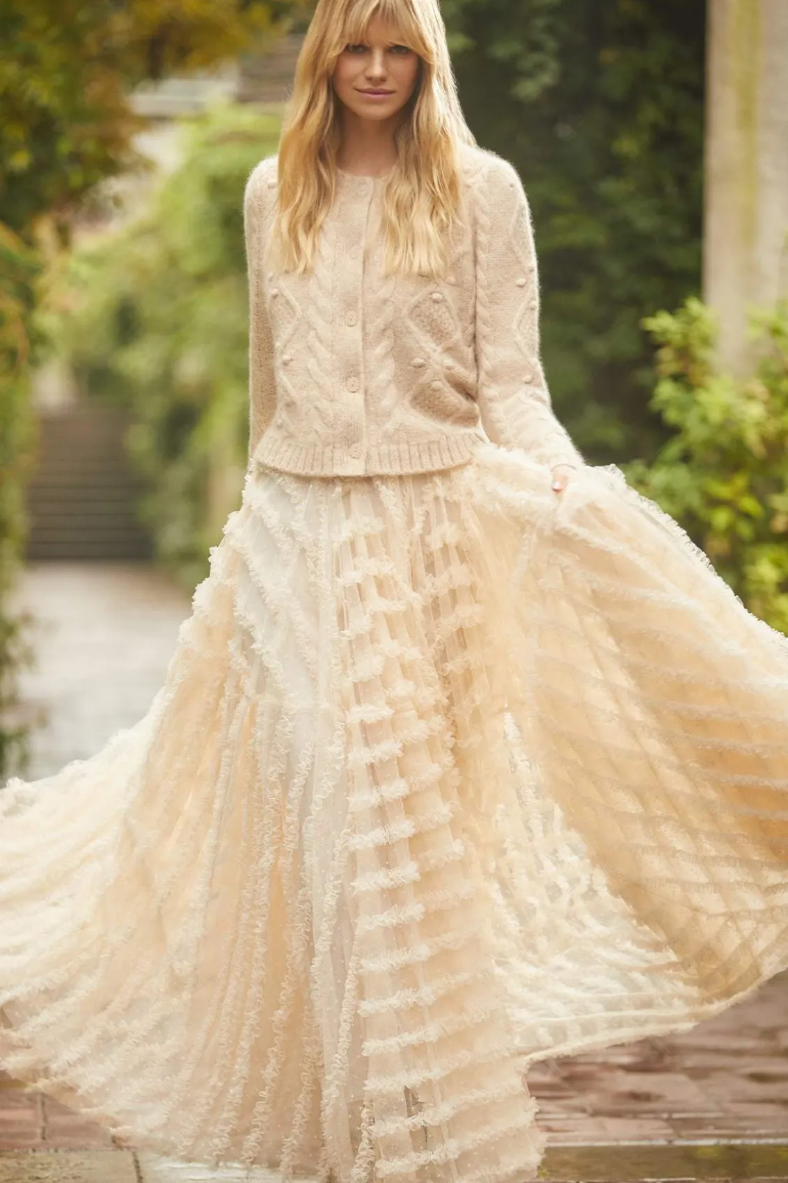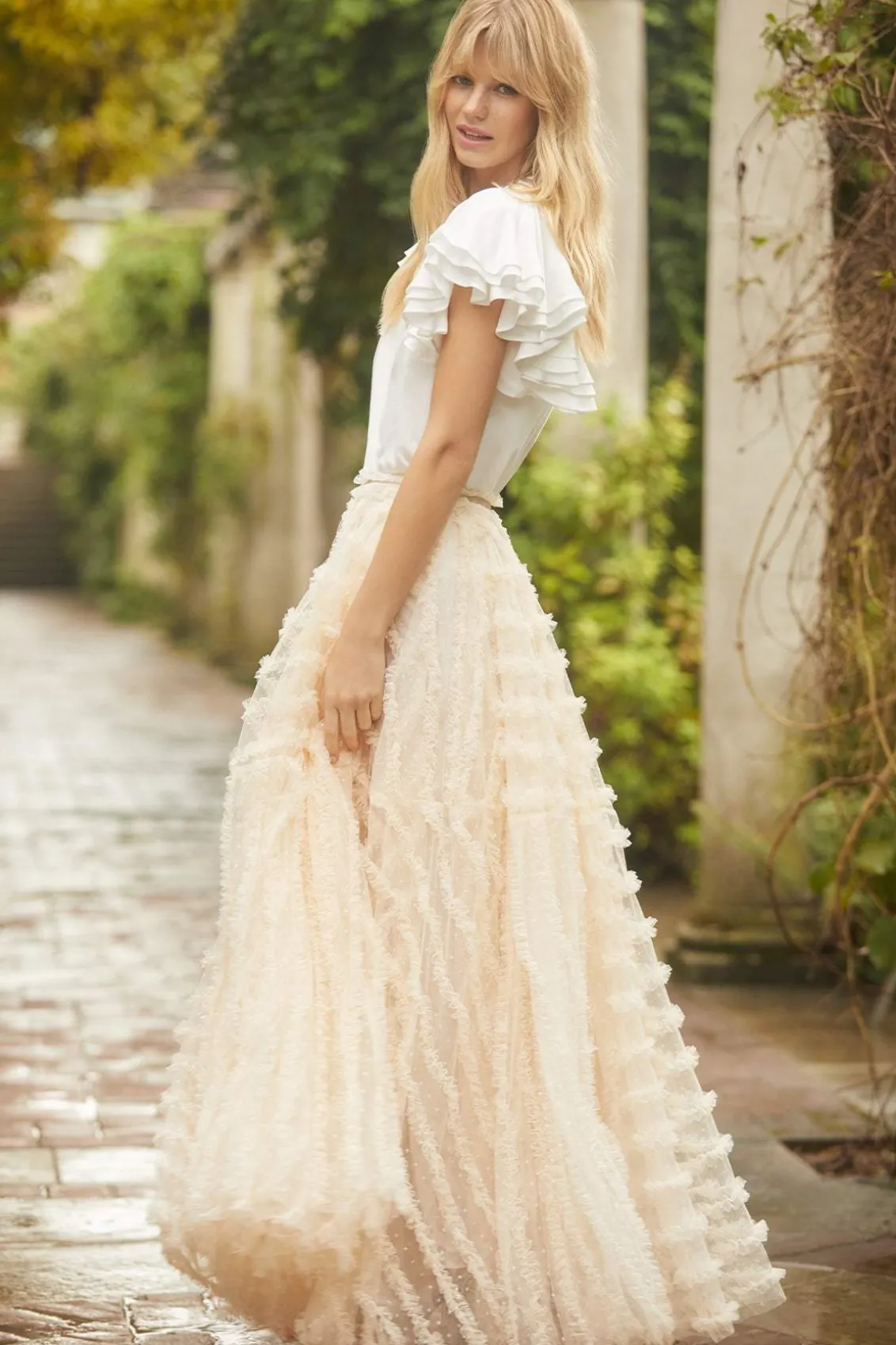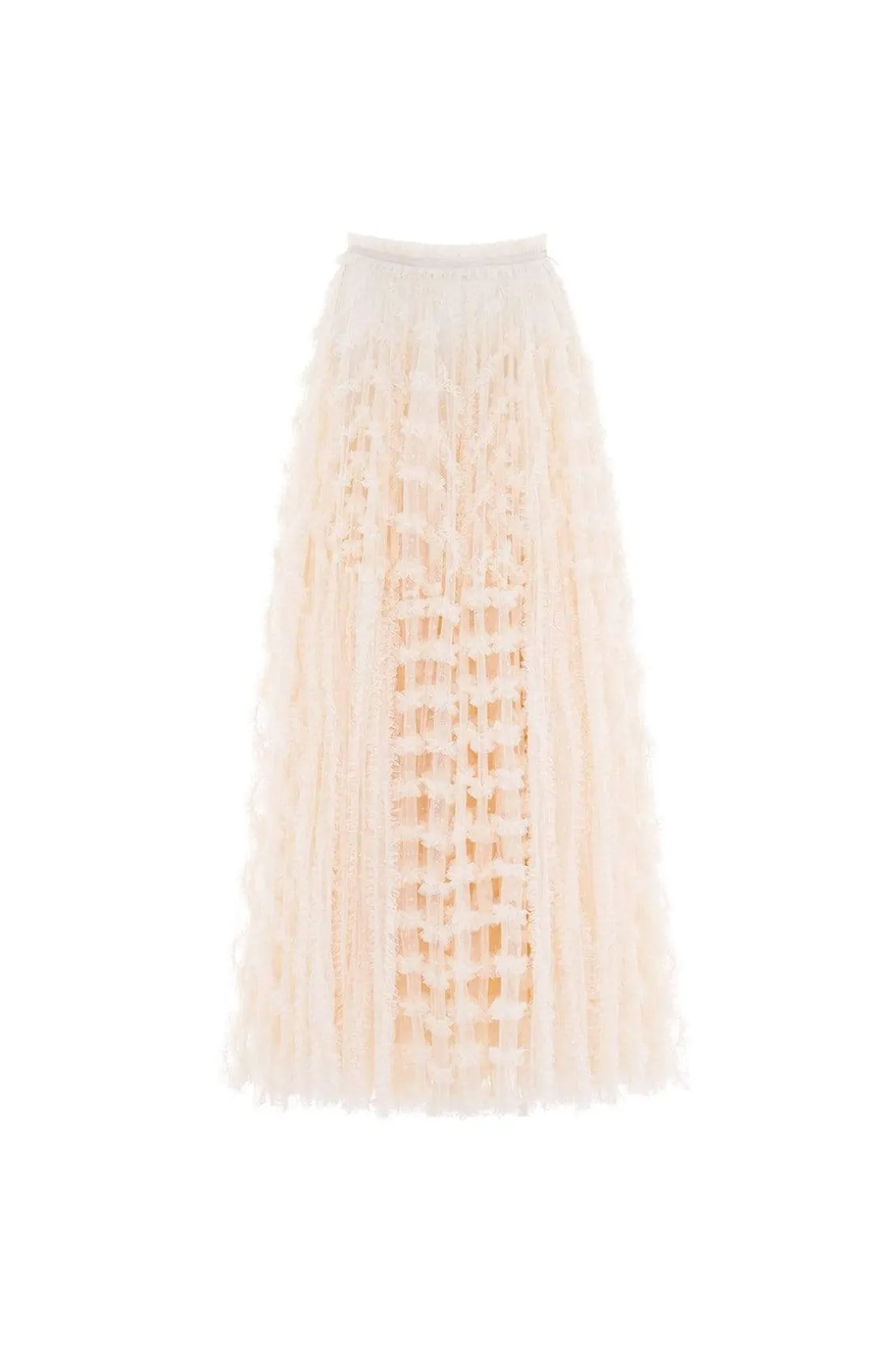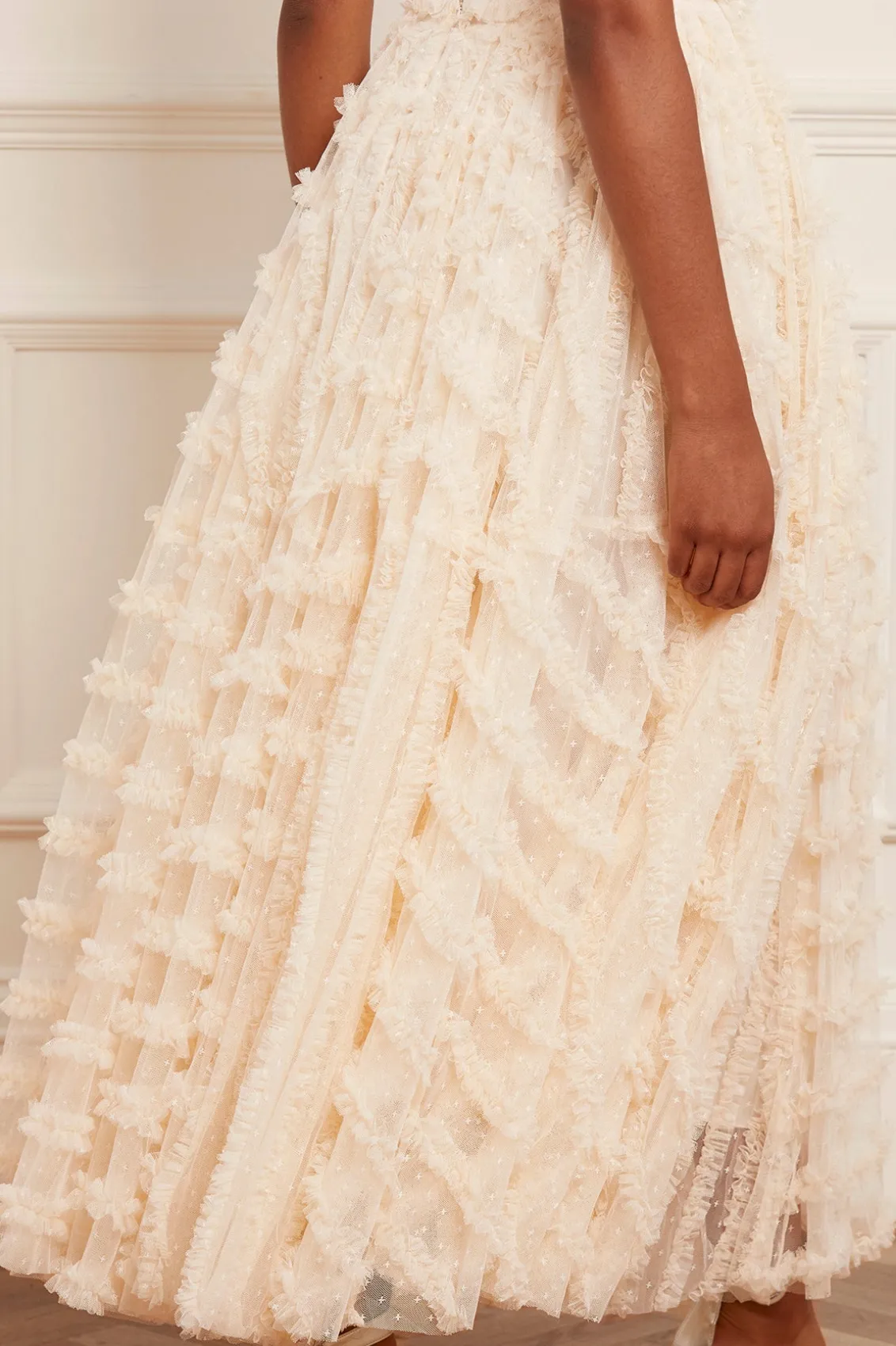 Meet the Florence Ruffle Ankle Skirt in Champagne. This beautiful skirt is crafted with layers of kisses tulle, creating a voluminous romantic look. This ankle-length skirt is designed elegantly with a satin waistband and gathered neatly with tulle trims. Pair with your favourite knit and make an entrance this season.